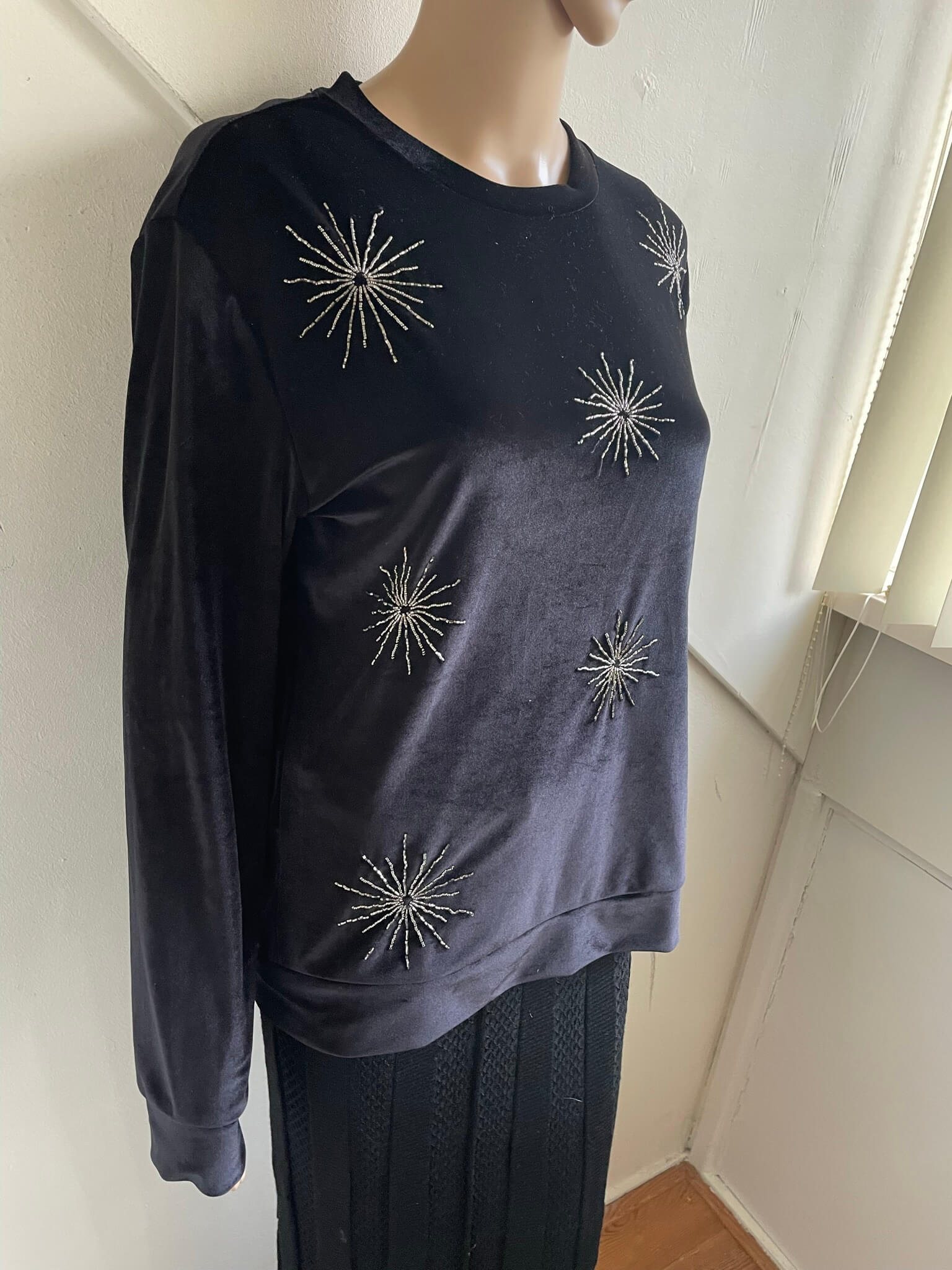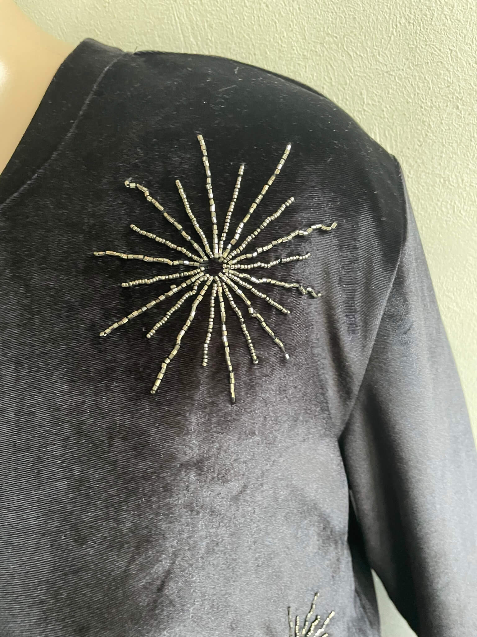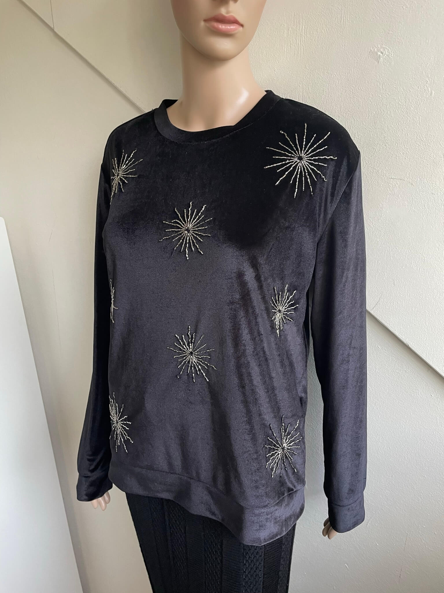 Zwarte trui sweater van fluweelachtige stof met sterren van glazen kraaltjes in de maat M. (38/40) Gemaakt van polyester en elastane en glazen kralen. Oksellengte 52 en lengte 59 cm.