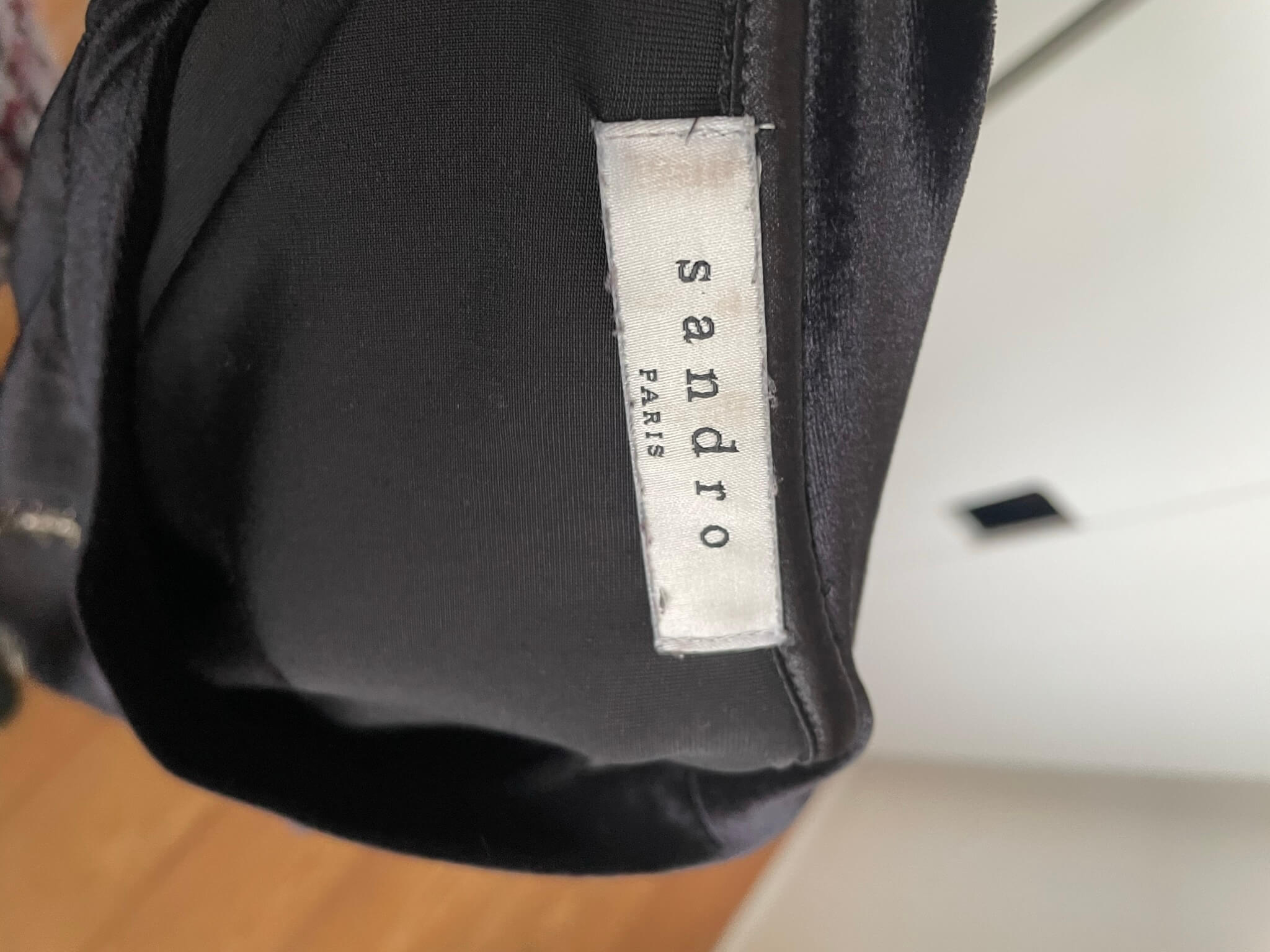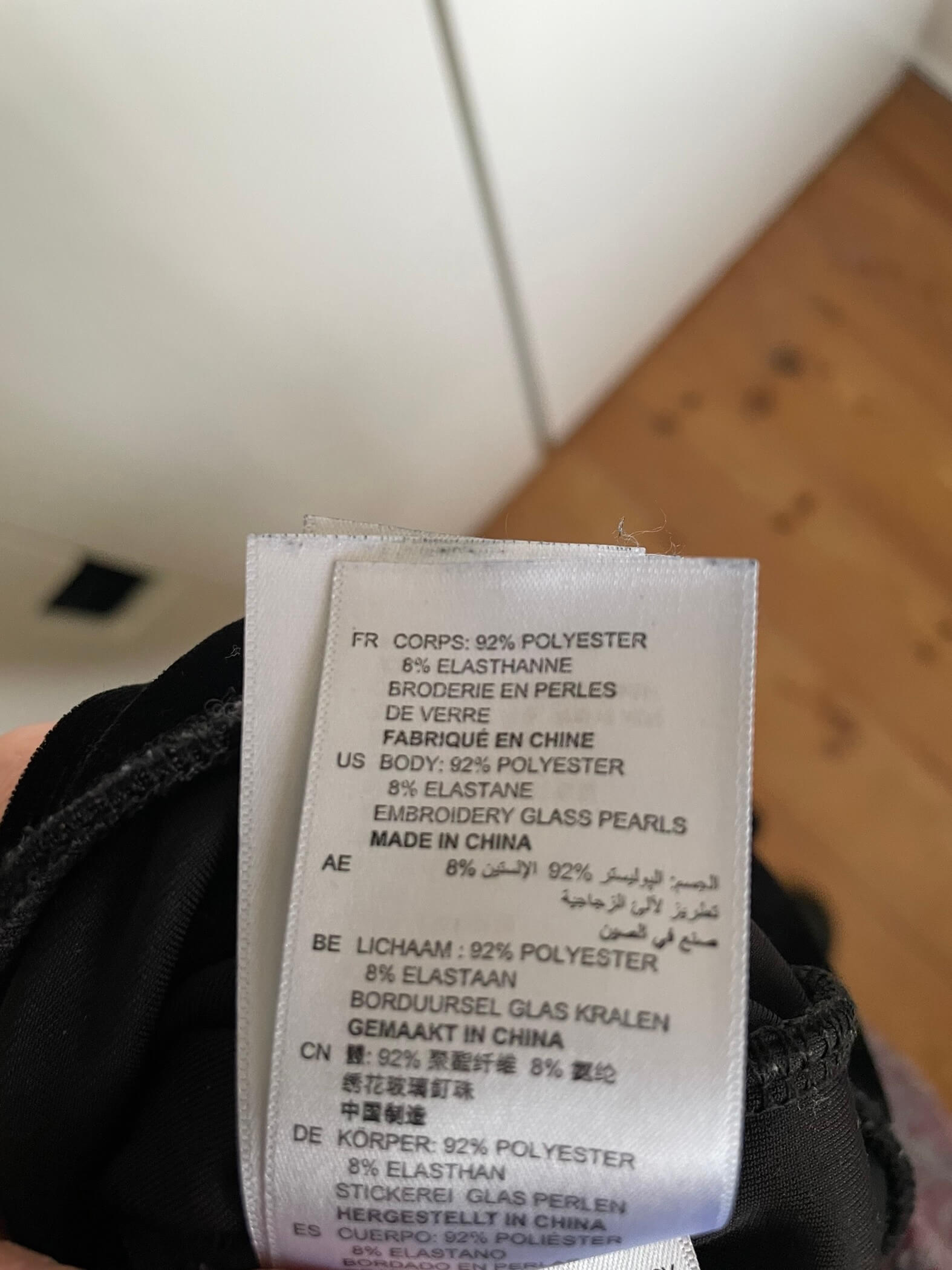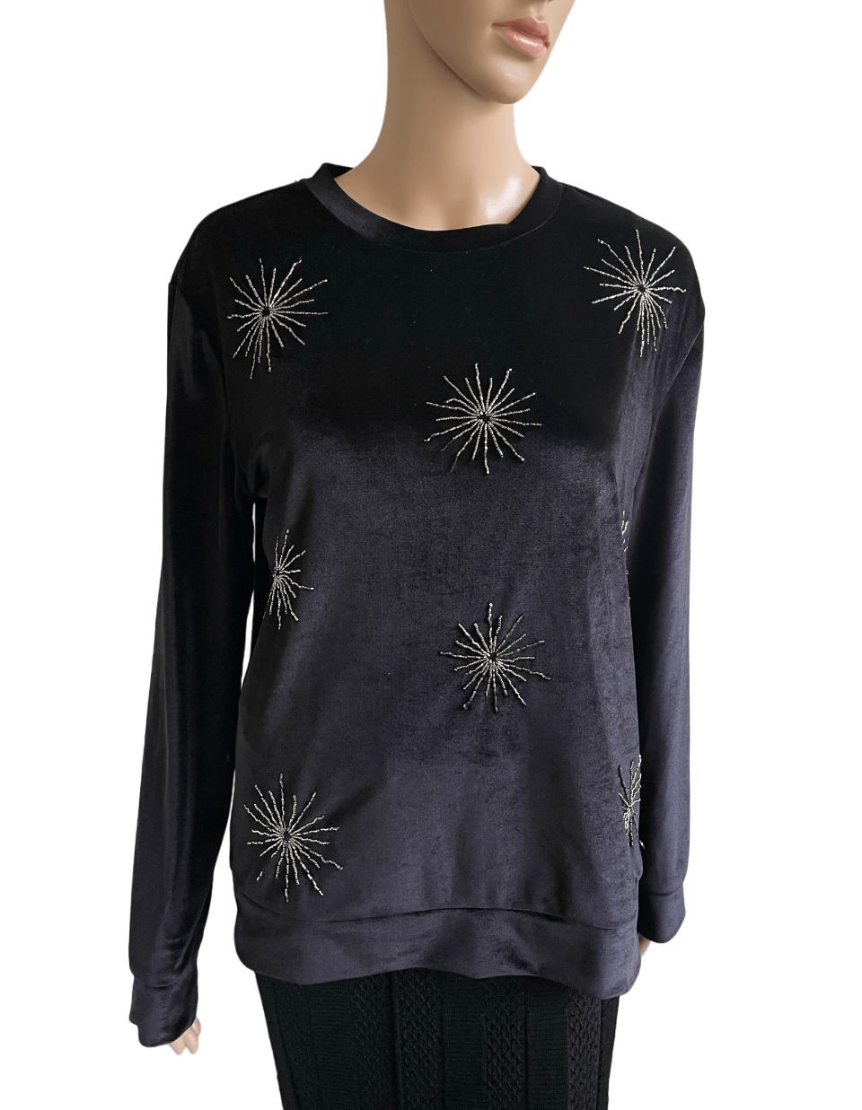 Zwarte trui sweater van fluweelachtige stof met sterren van glazen kraaltjes in de maat M. (38/40) Gemaakt van polyester en elastane en glazen kralen. Oksellengte 52 en lengte 59 cm.