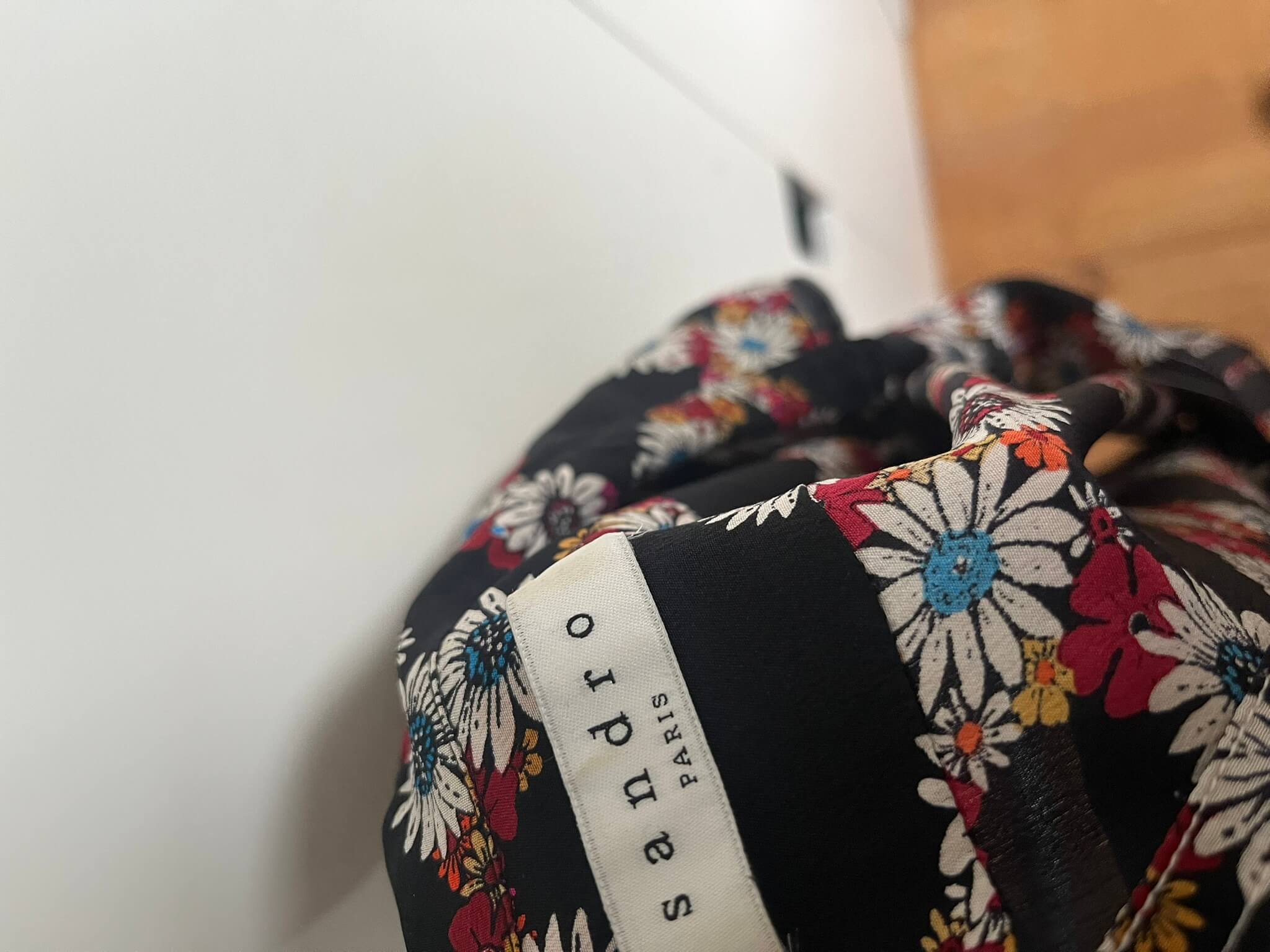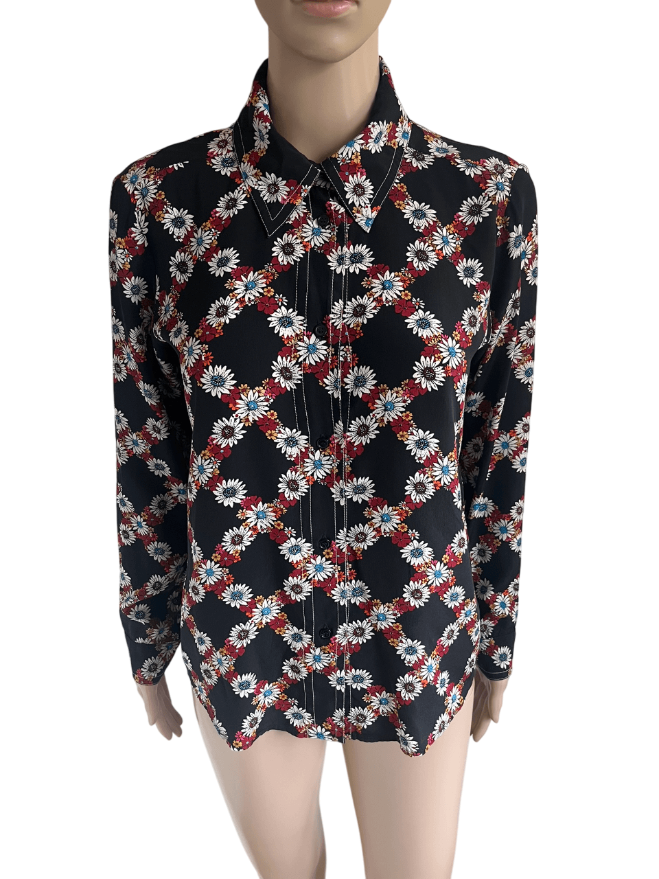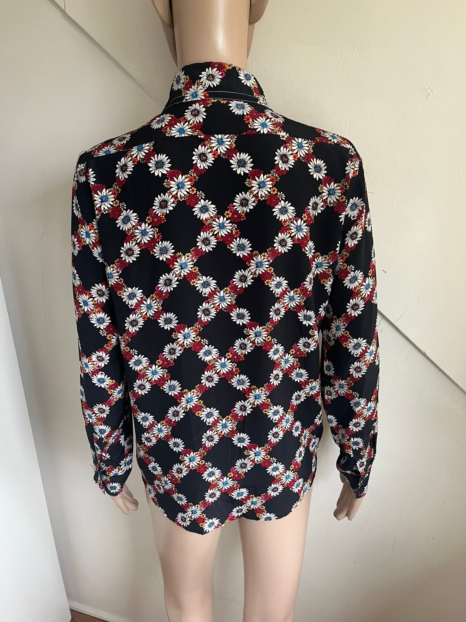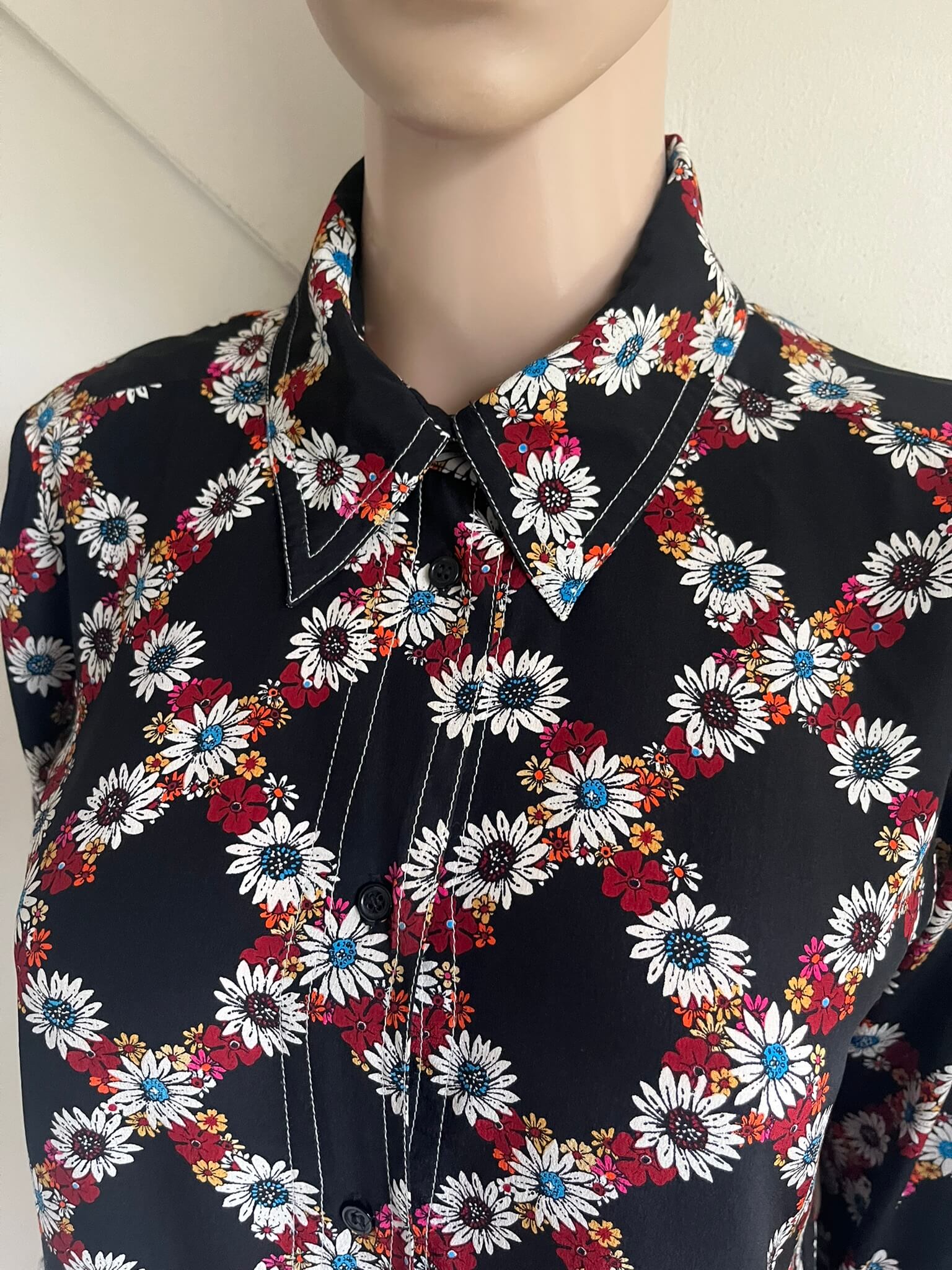 Zwarte zijden blouse met bloemenprint , wit geel rood etc. Gemaakt van 100% zijde. Oksellengte 49 cm en lengte 63 cm.