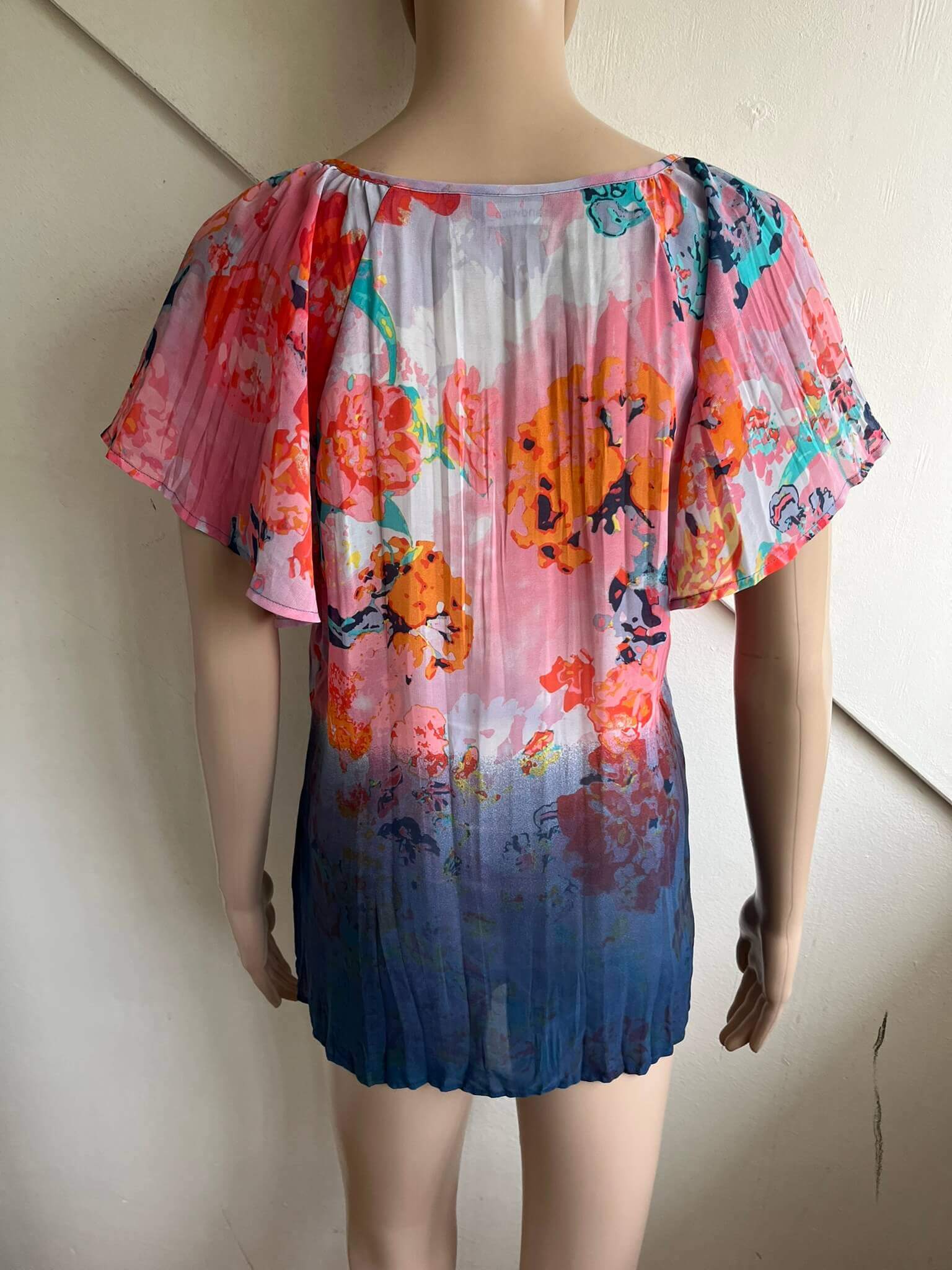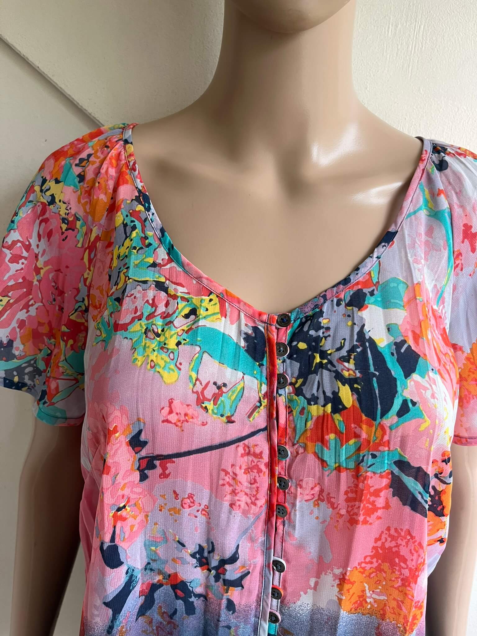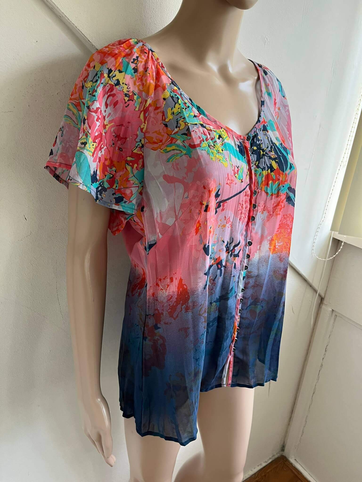 Kleurrijke dunne blouse (licht doorschijnend) met korte mouwen in de maat 38. Gemaakt van polyester. De stof heeft een licht plissé effect. Oksellengte 49 cm en lengte 70 cm.