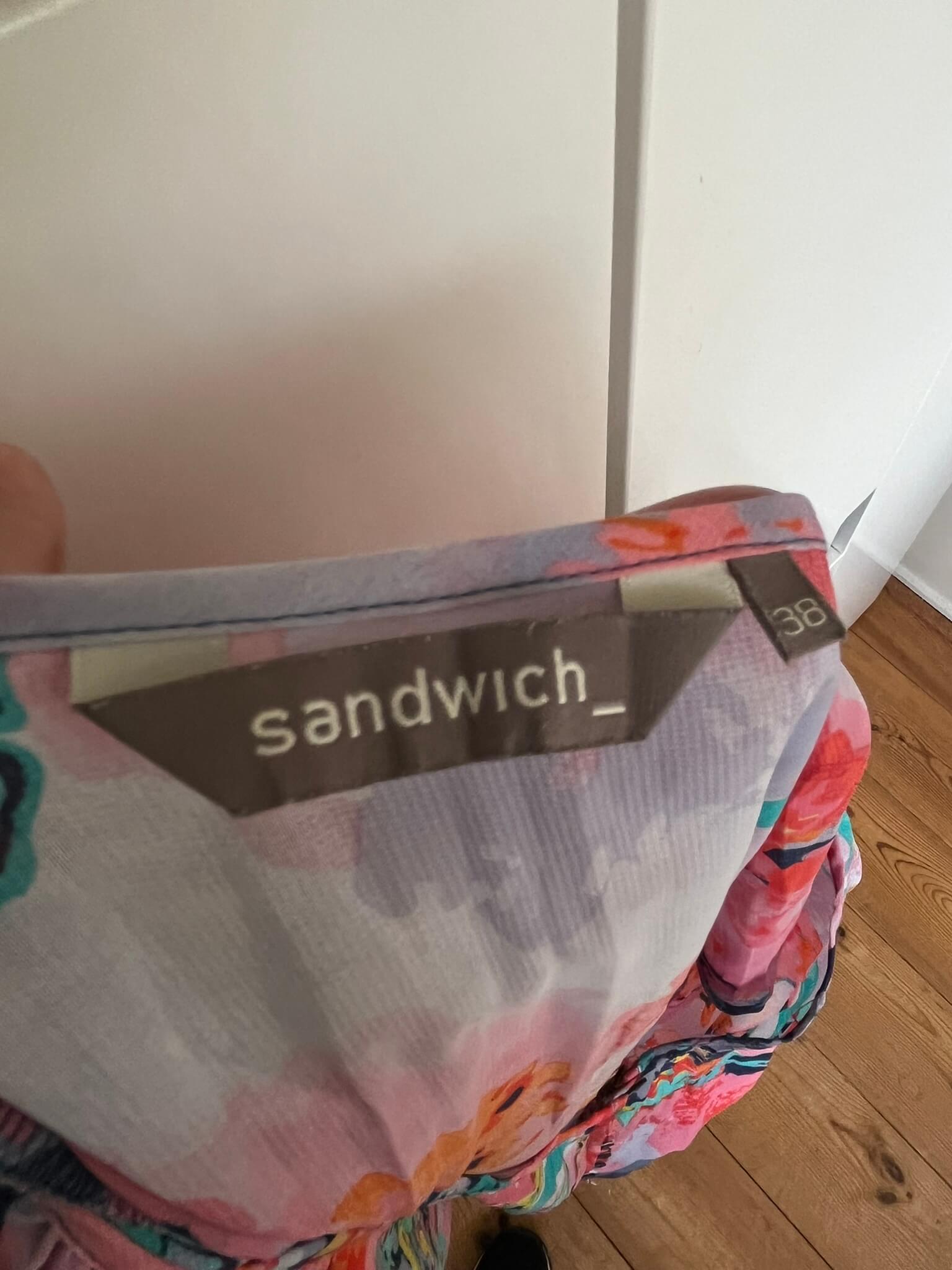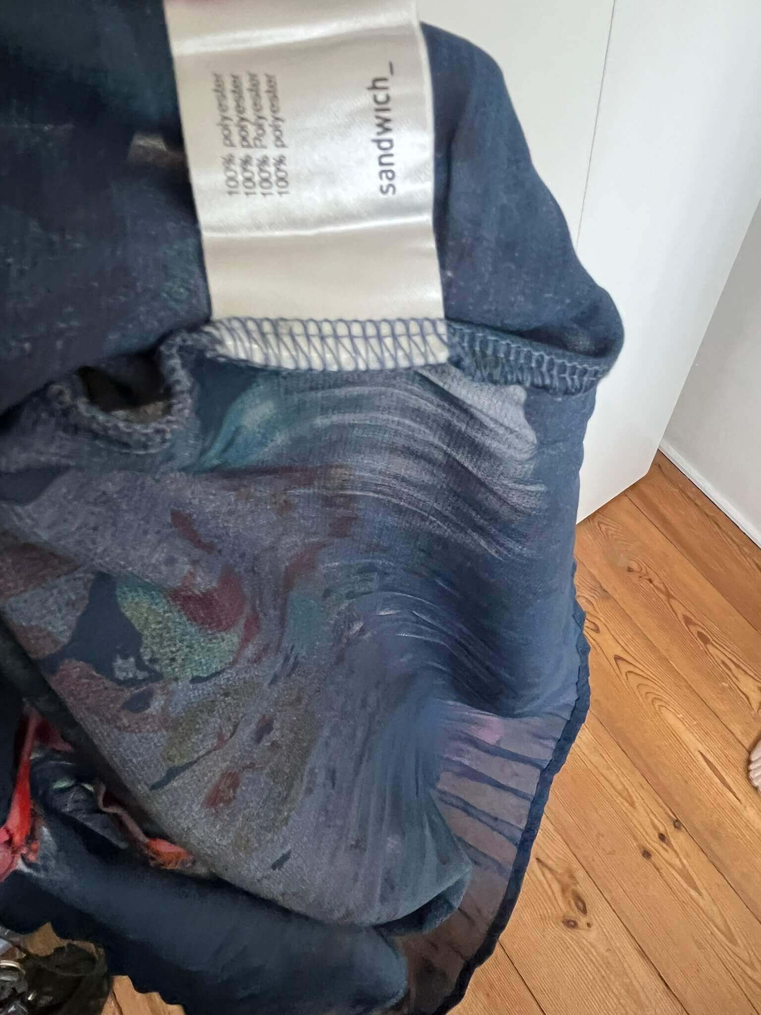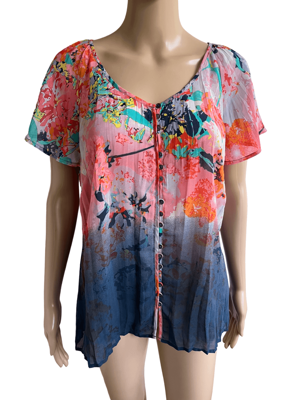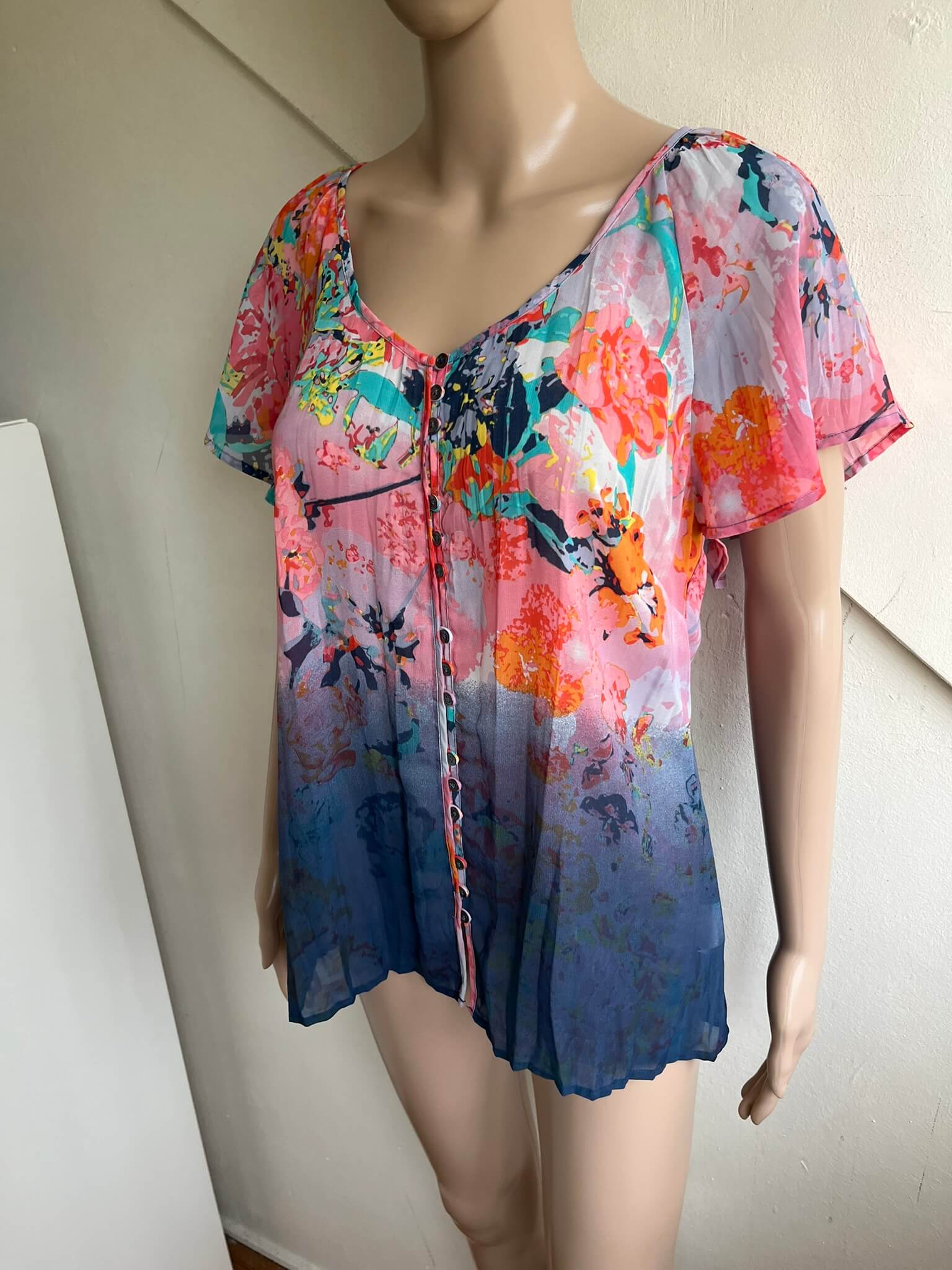 Kleurrijke dunne blouse (licht doorschijnend) met korte mouwen in de maat 38. Gemaakt van polyester. De stof heeft een licht plissé effect. Oksellengte 49 cm en lengte 70 cm.