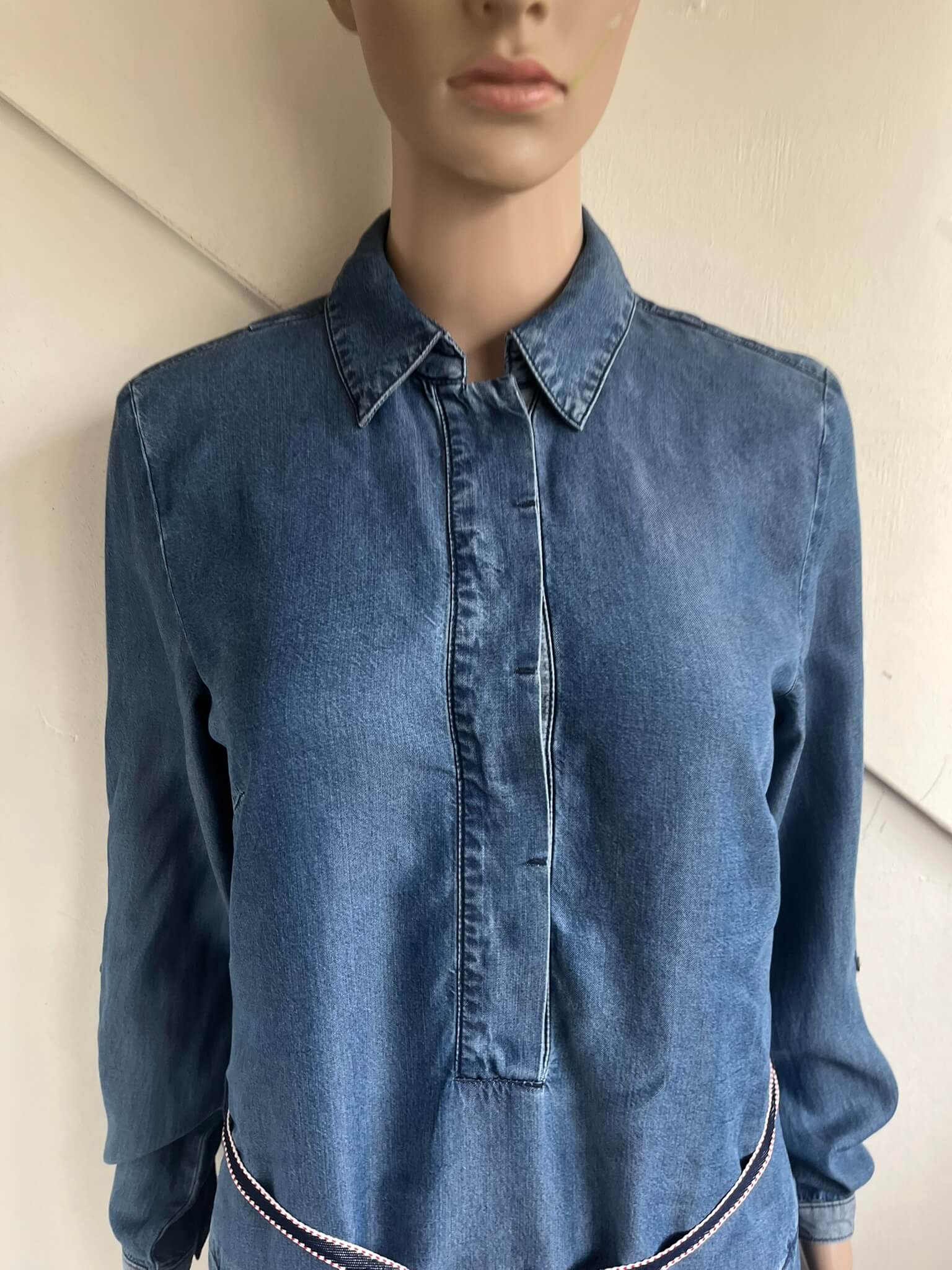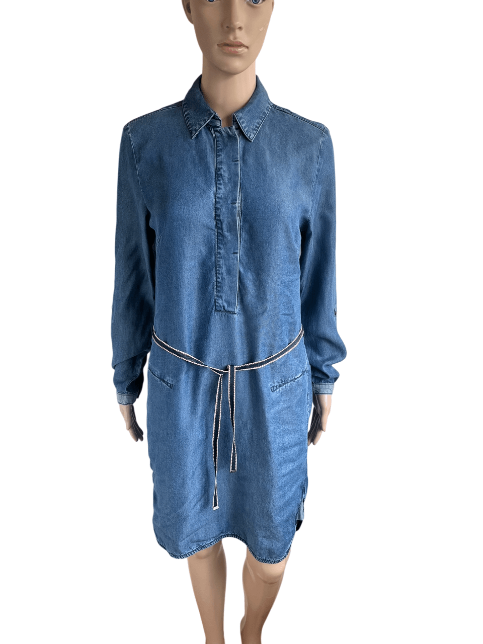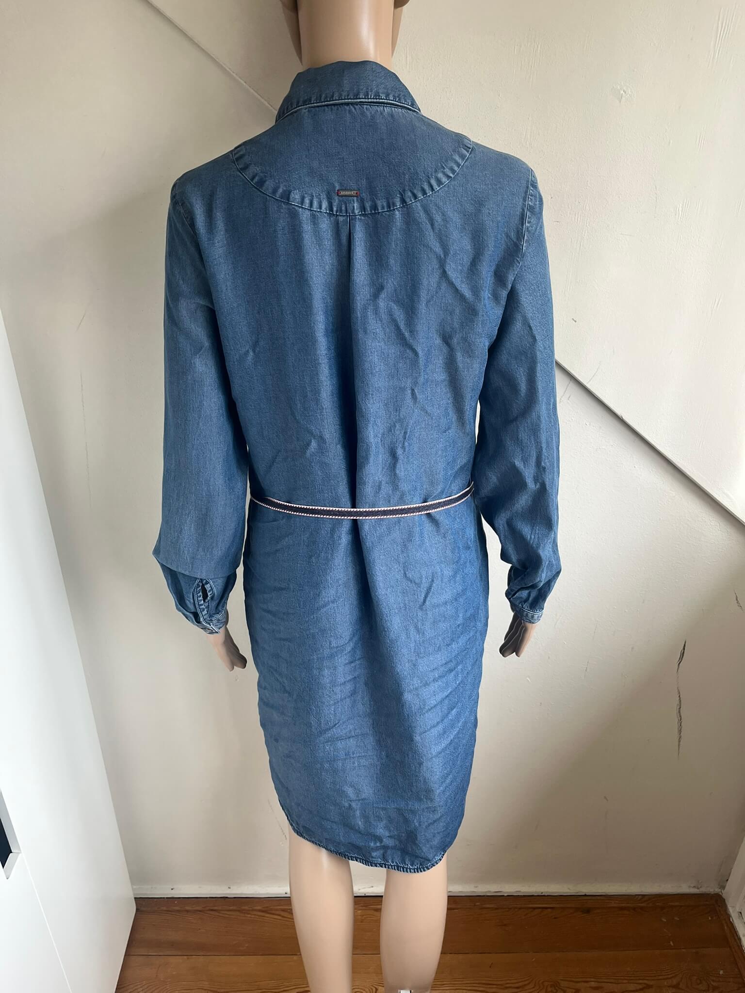 Blauw dunne spijkerjurk met losse riem in de maat XS. Gemaakt van lyocell. Oksellengte 48 cm en lengte 91 cm.
