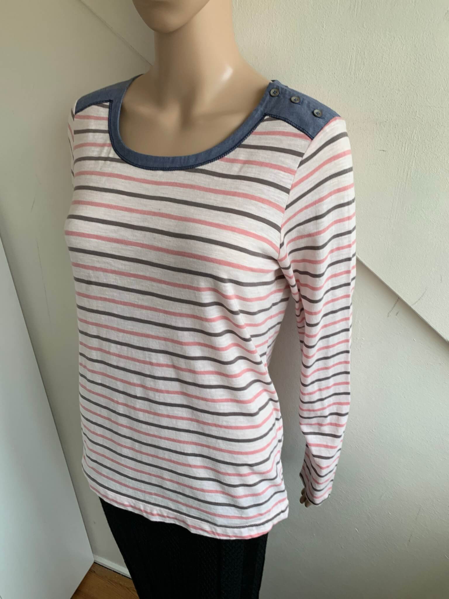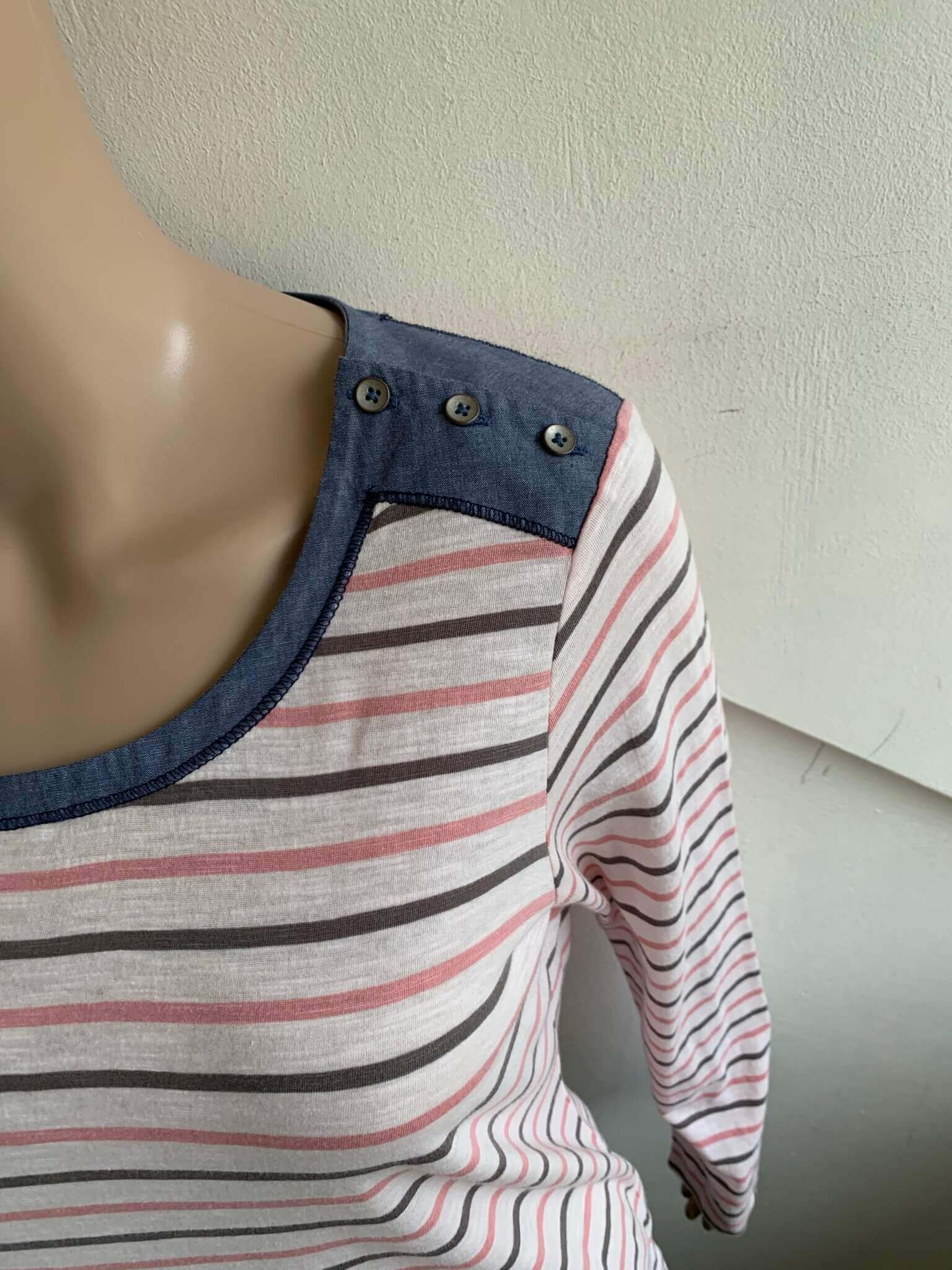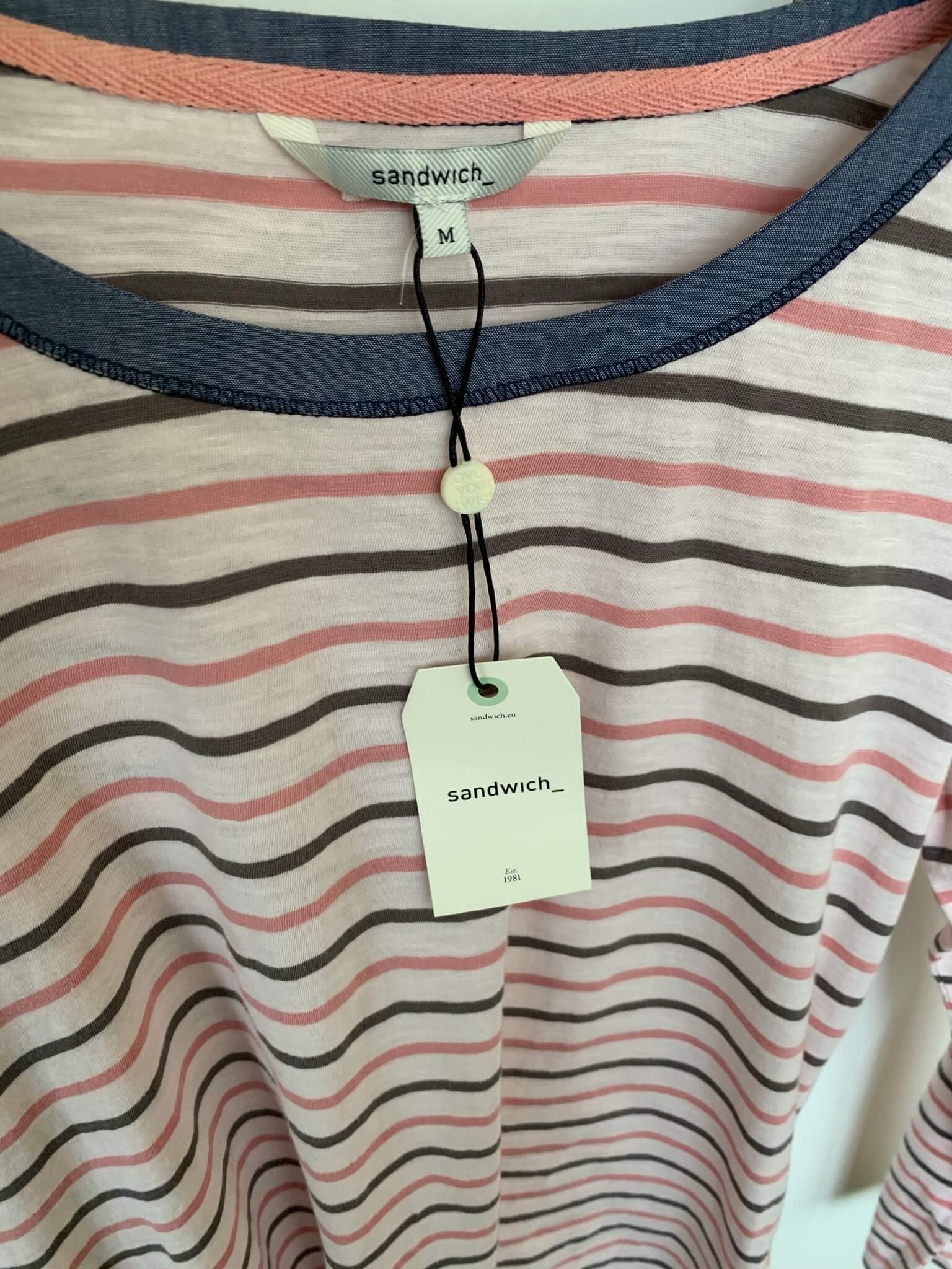 Nieuwe gestreepte longsleeve top in de maat M. Offwhite met roze en zwarte strepen en blauwe details. Gemaakt van katoen. Oksellengte 50 cm.