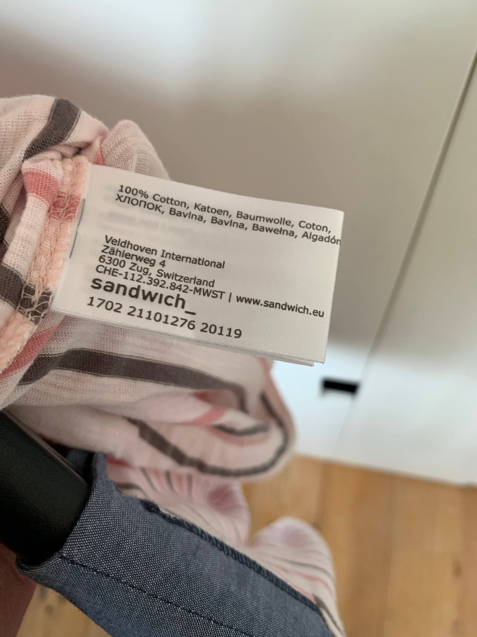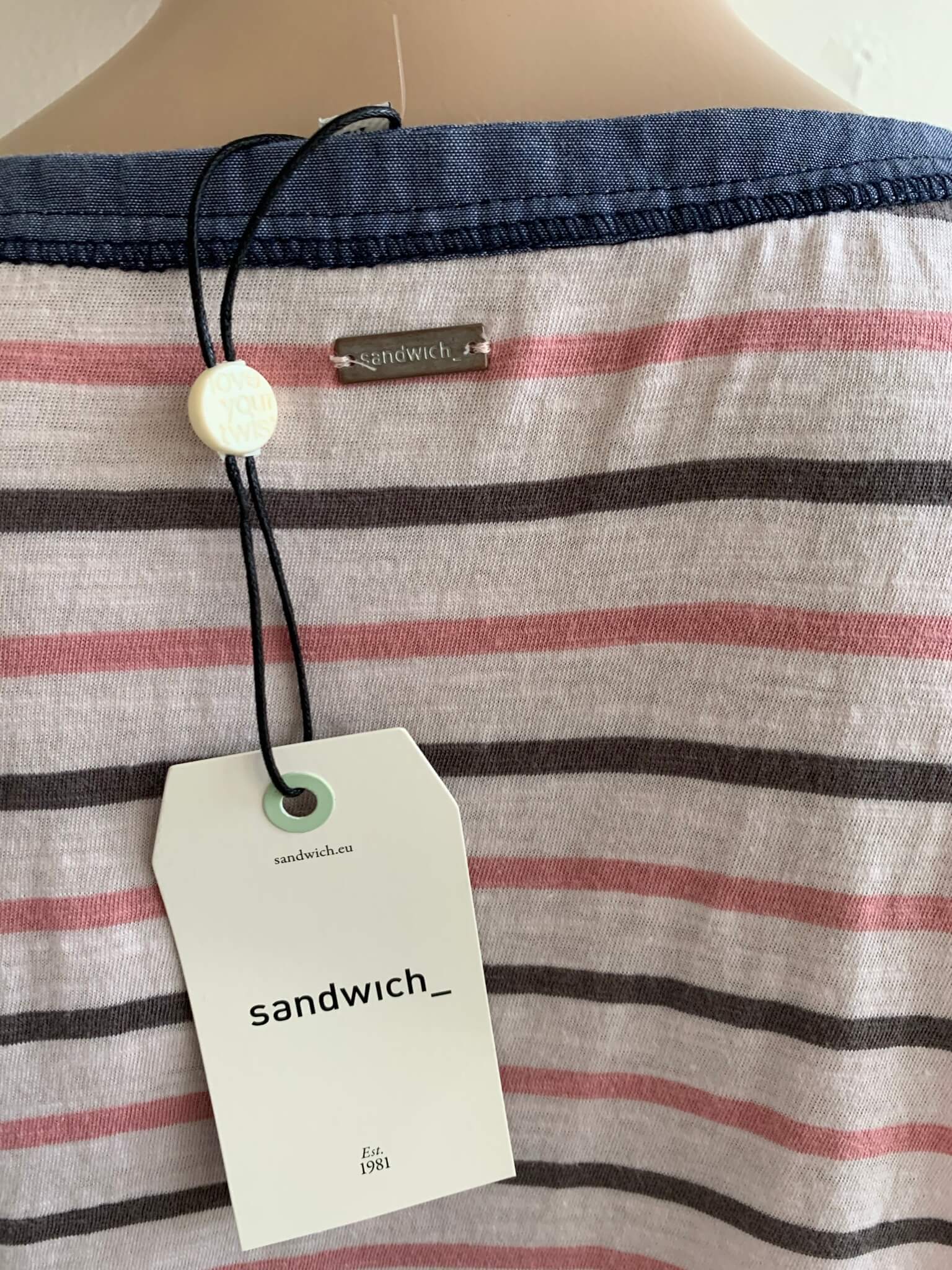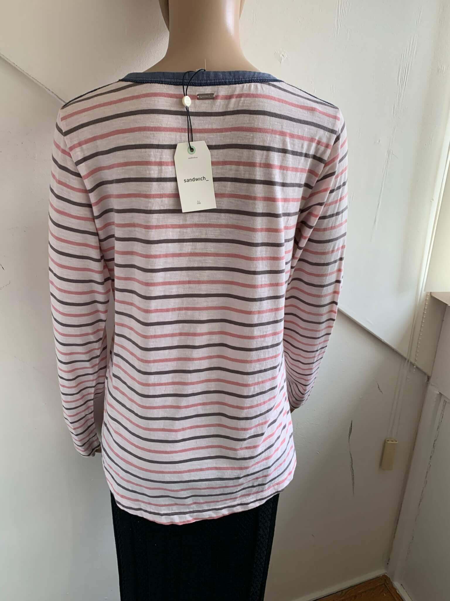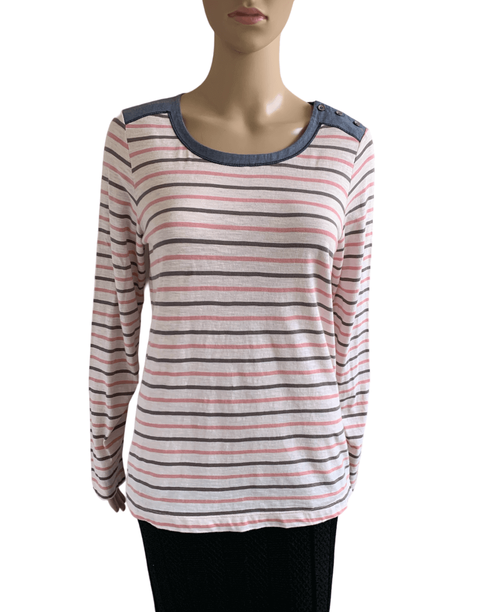 Nieuwe gestreepte longsleeve top in de maat M. Offwhite met roze en zwarte strepen en blauwe details. Gemaakt van katoen. Oksellengte 50 cm.