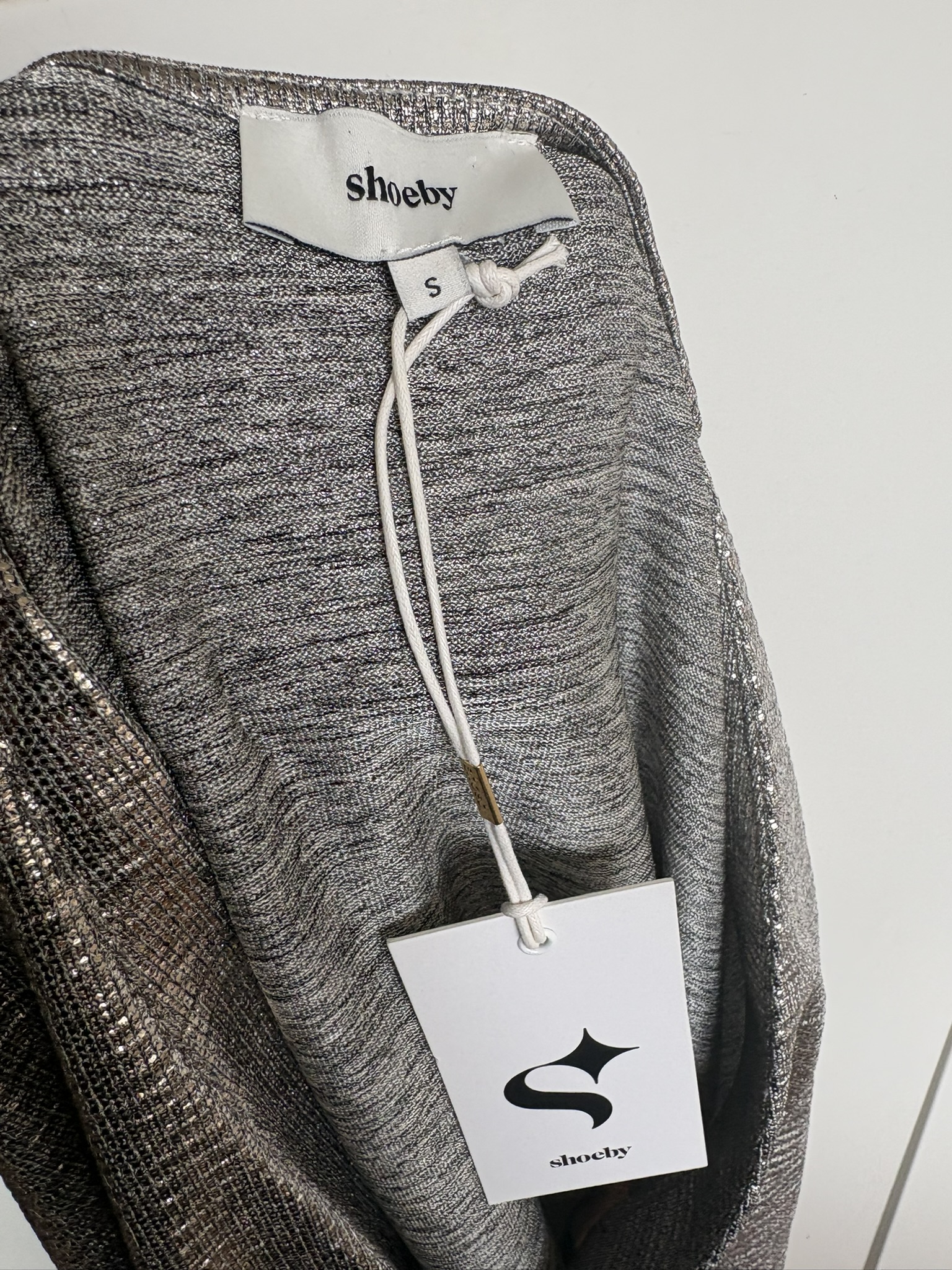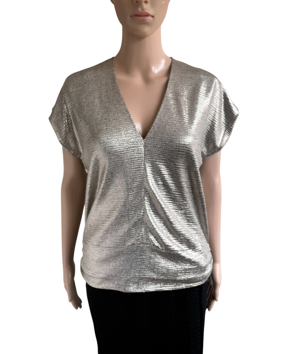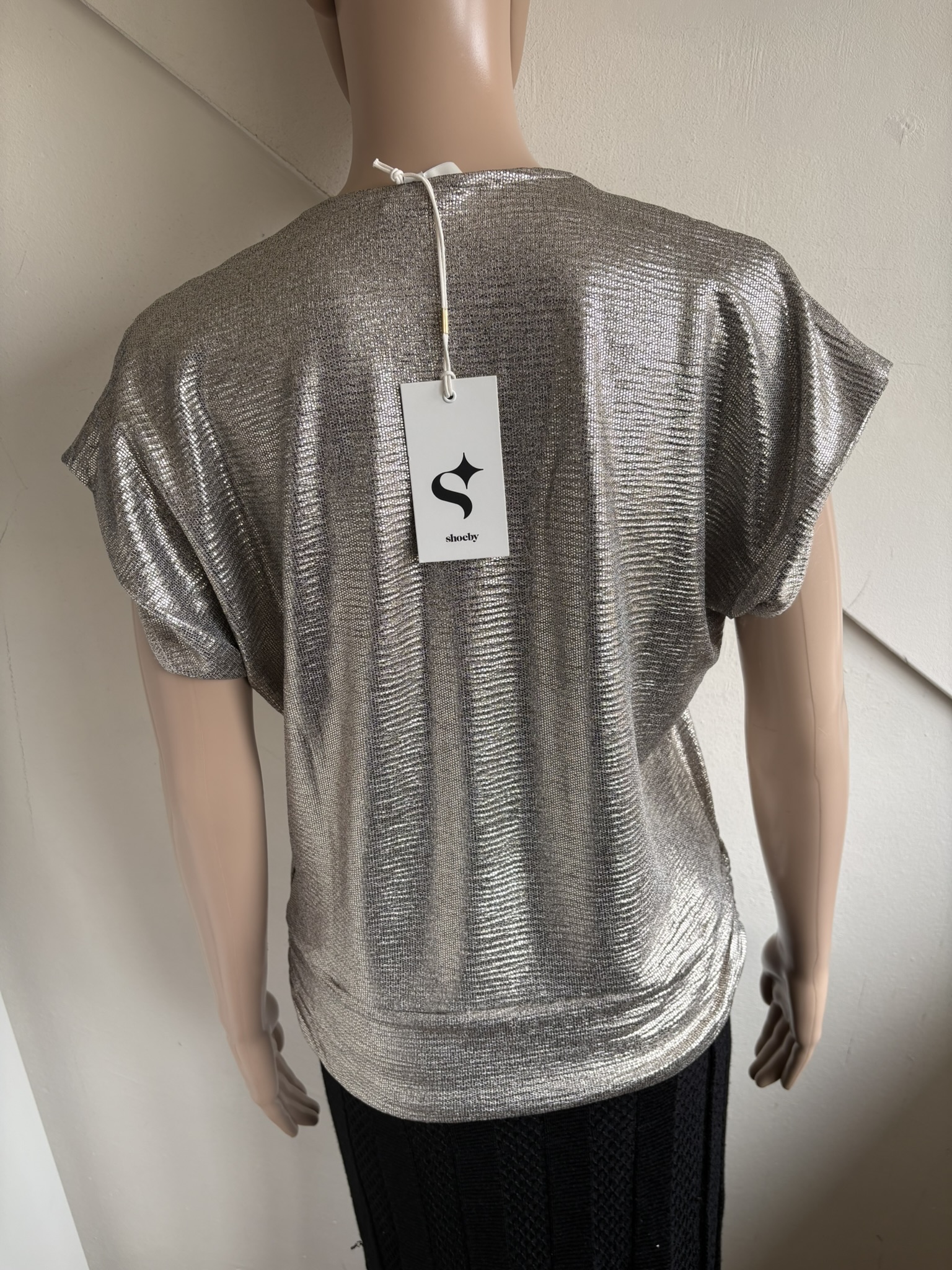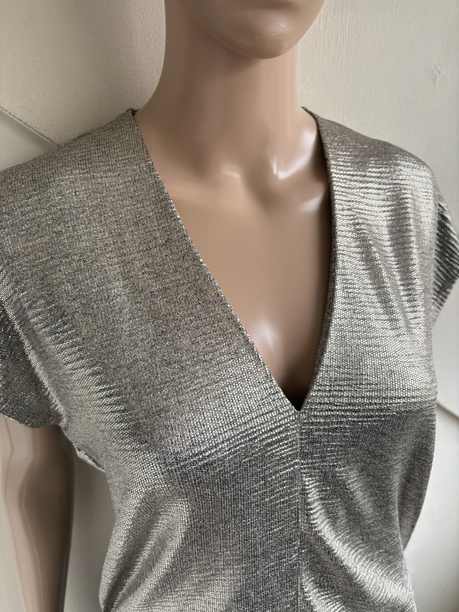 Zilverkleurige nieuwe top met gestreept motief in de maat S. Oksellengte 49 cm en lengte 56 cm.