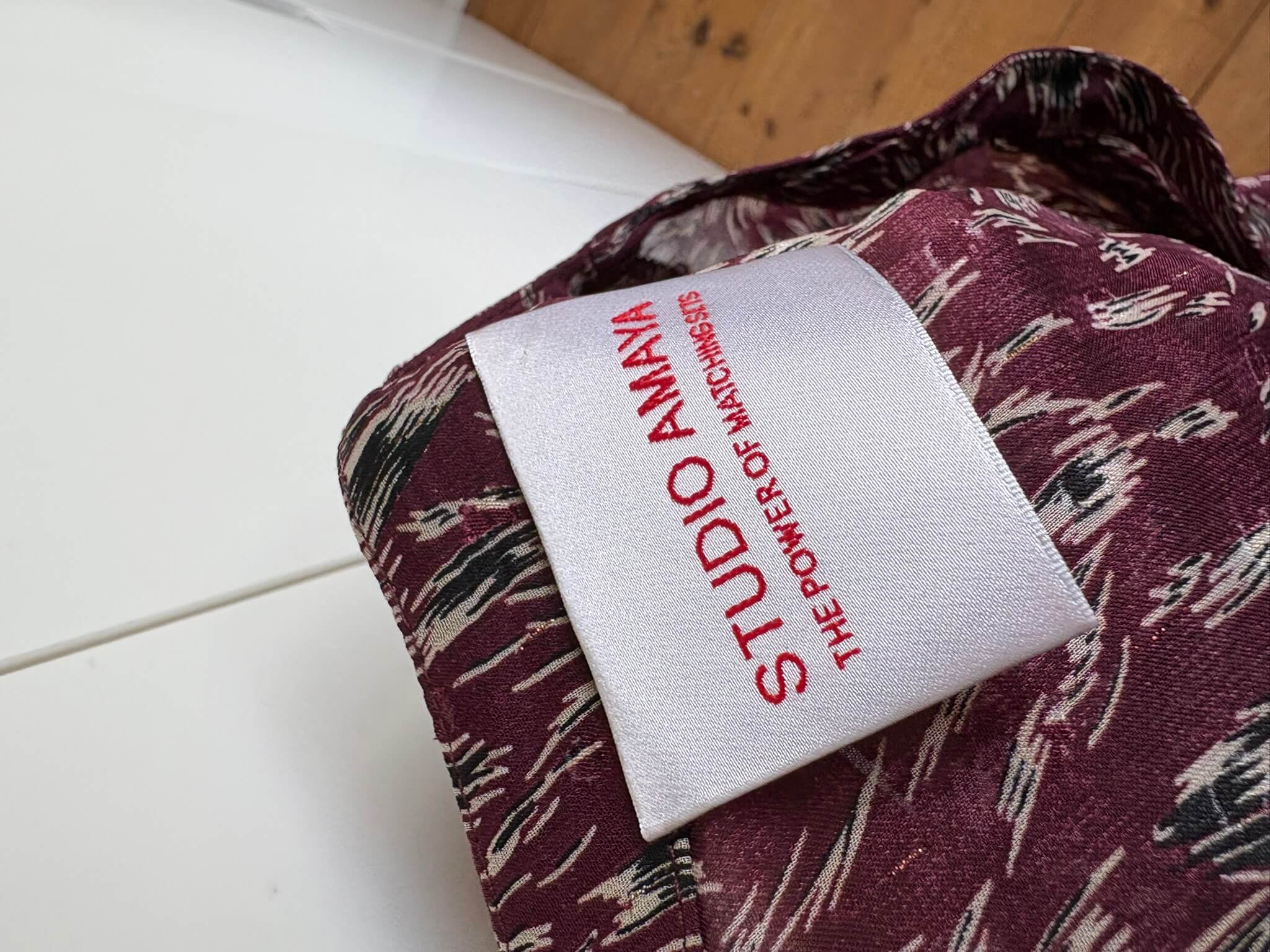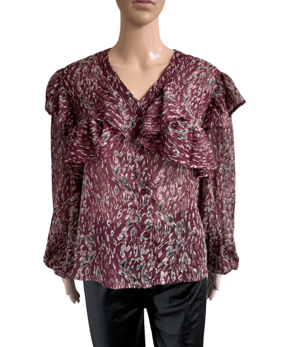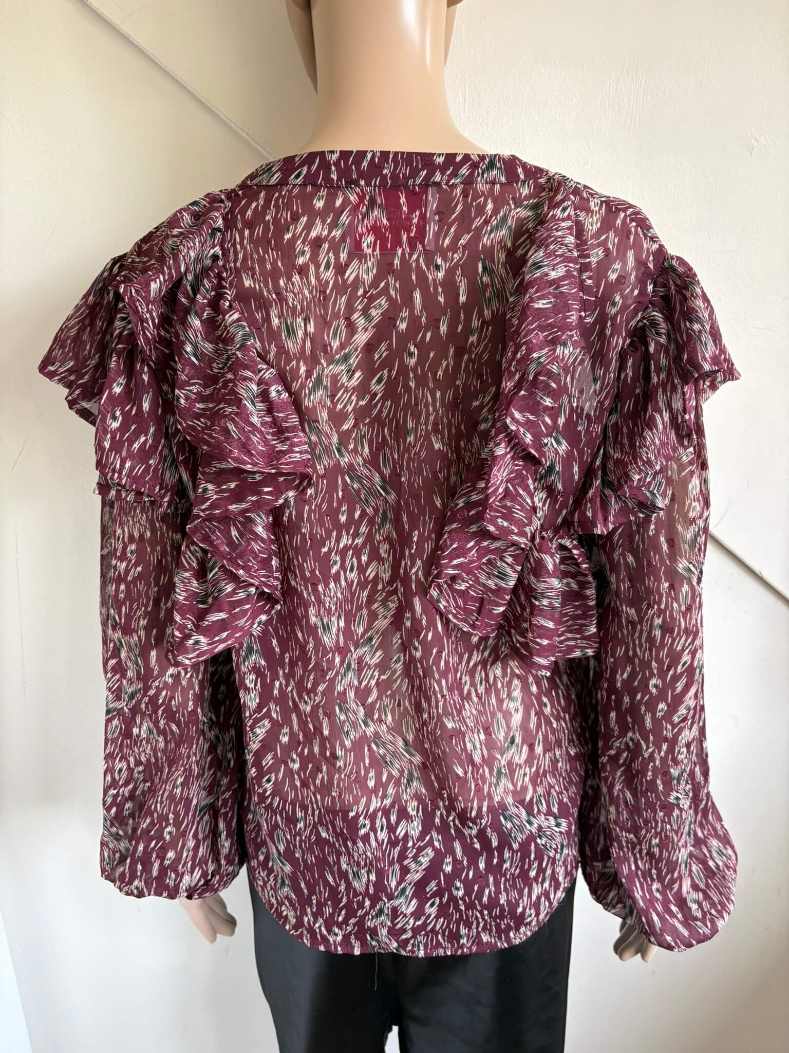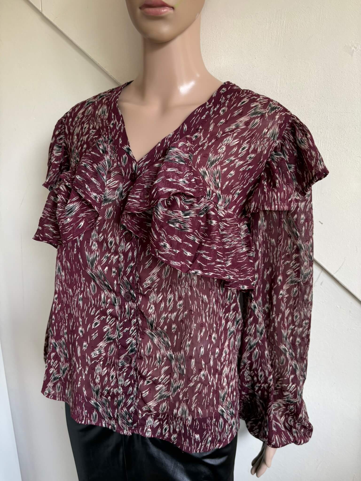 Bordeauxrode blouse met roezels en een wit, zwart en glinster print, in de maat S. Daisy Blouse, gemaakt van 100% polyester. Oksellengte 52 cm en lengte 55 cm.