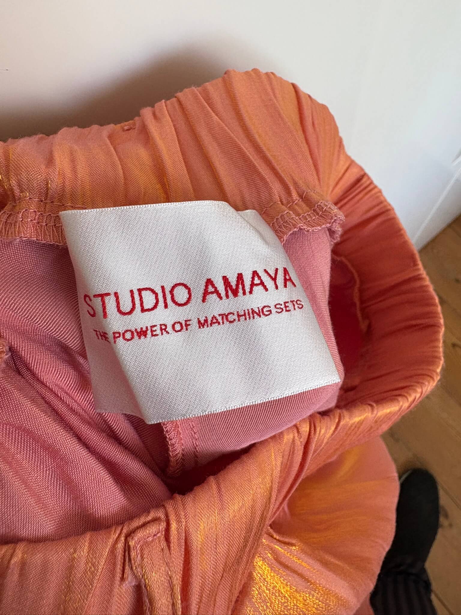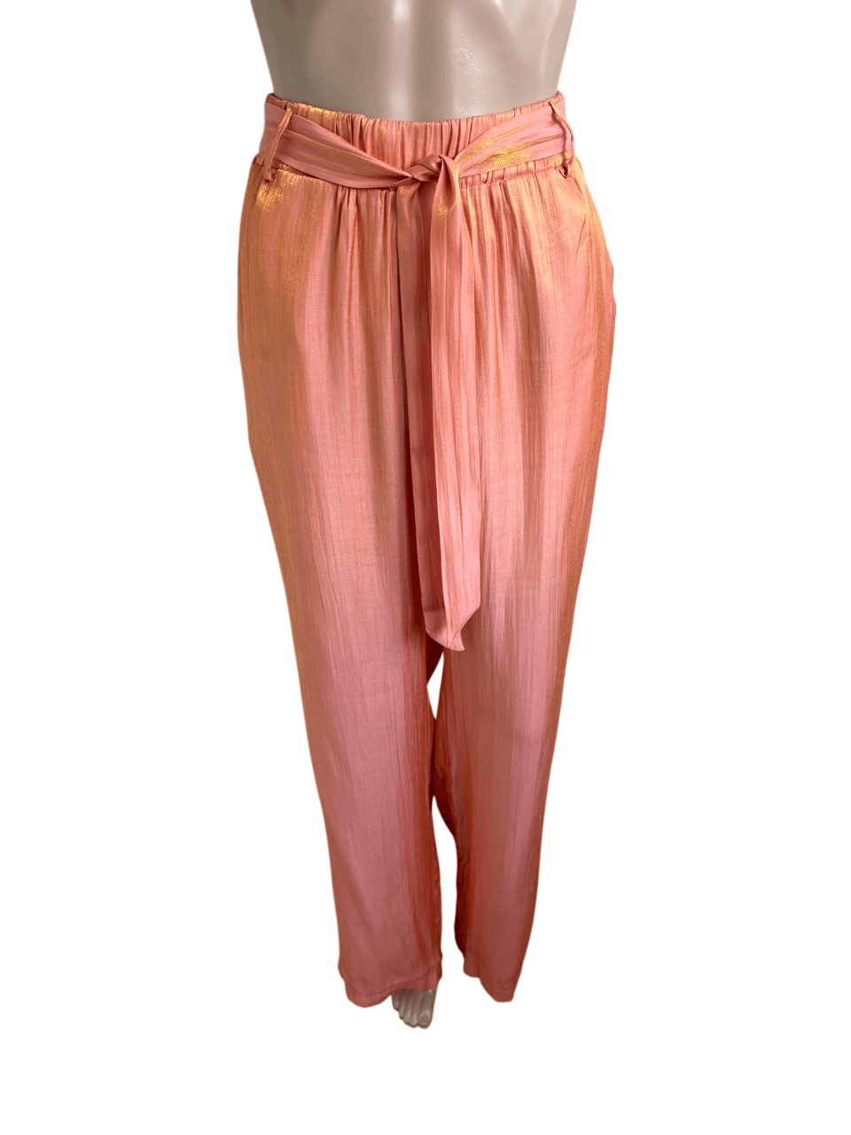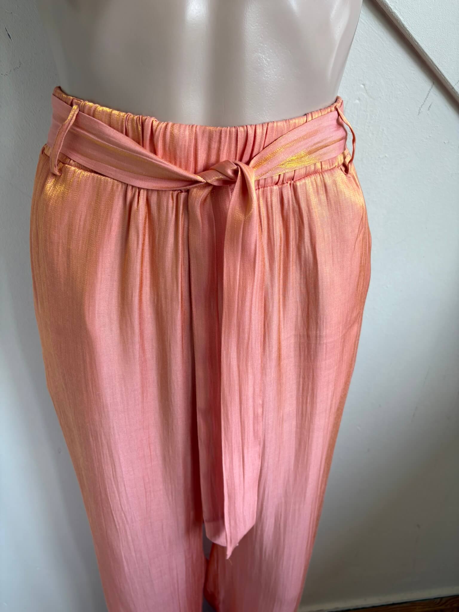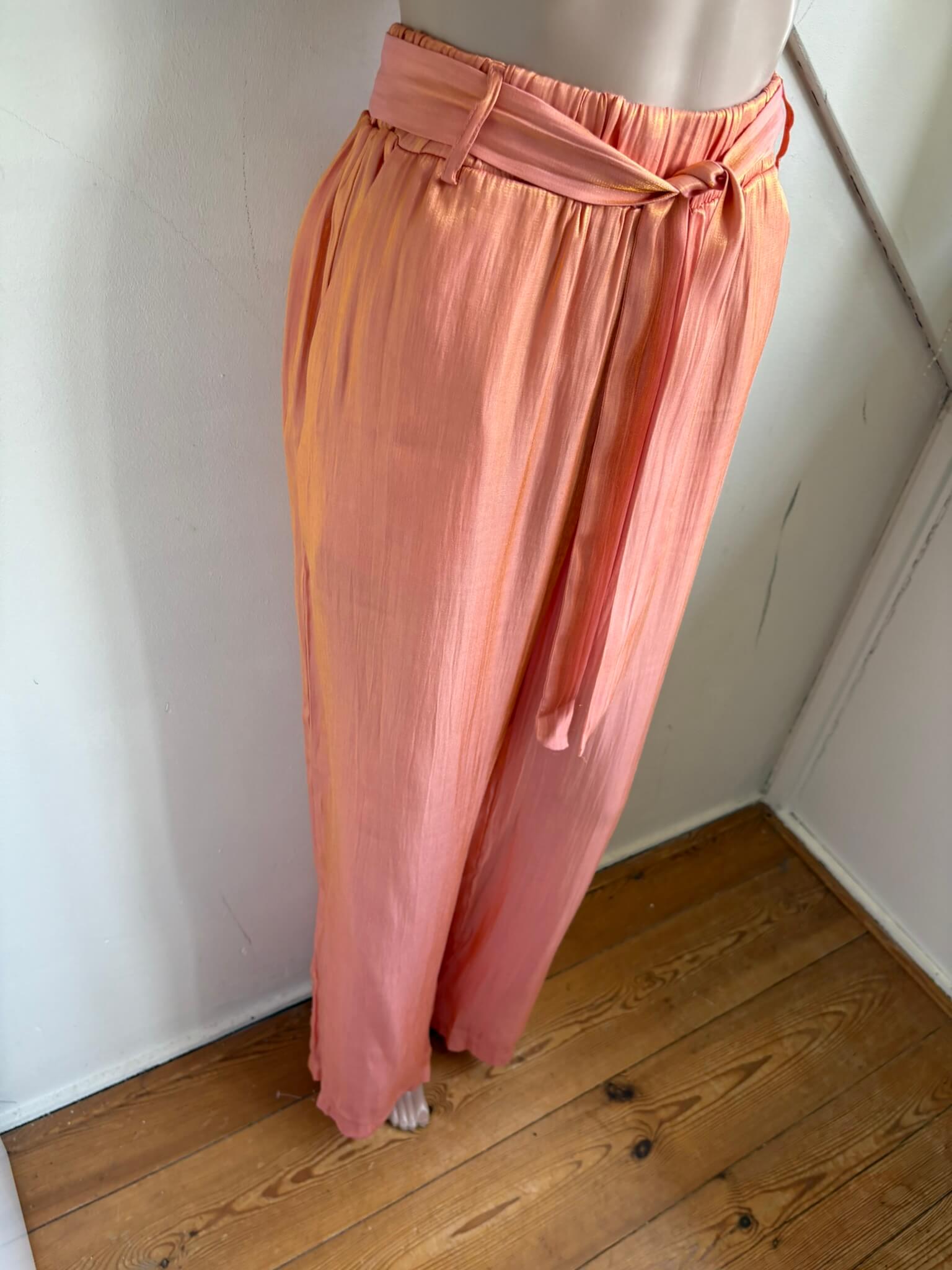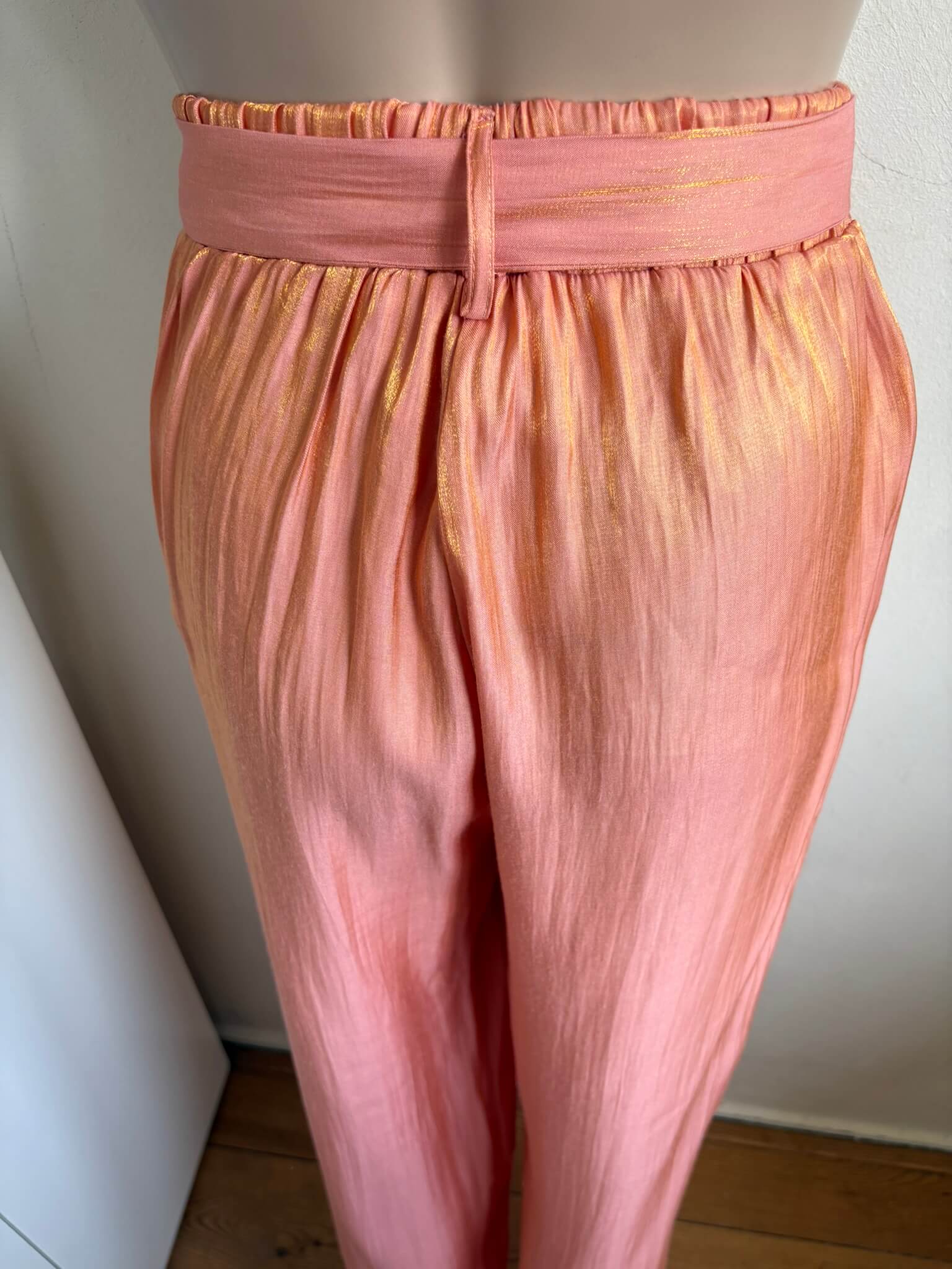 Oranje broek met gouden gloed, wijdere pijpen en met losse riem in de maat S. “Carmen pants”, gemaakt van viscose en polyester. Taillewijdte 34 cm en lengte 111 cm.