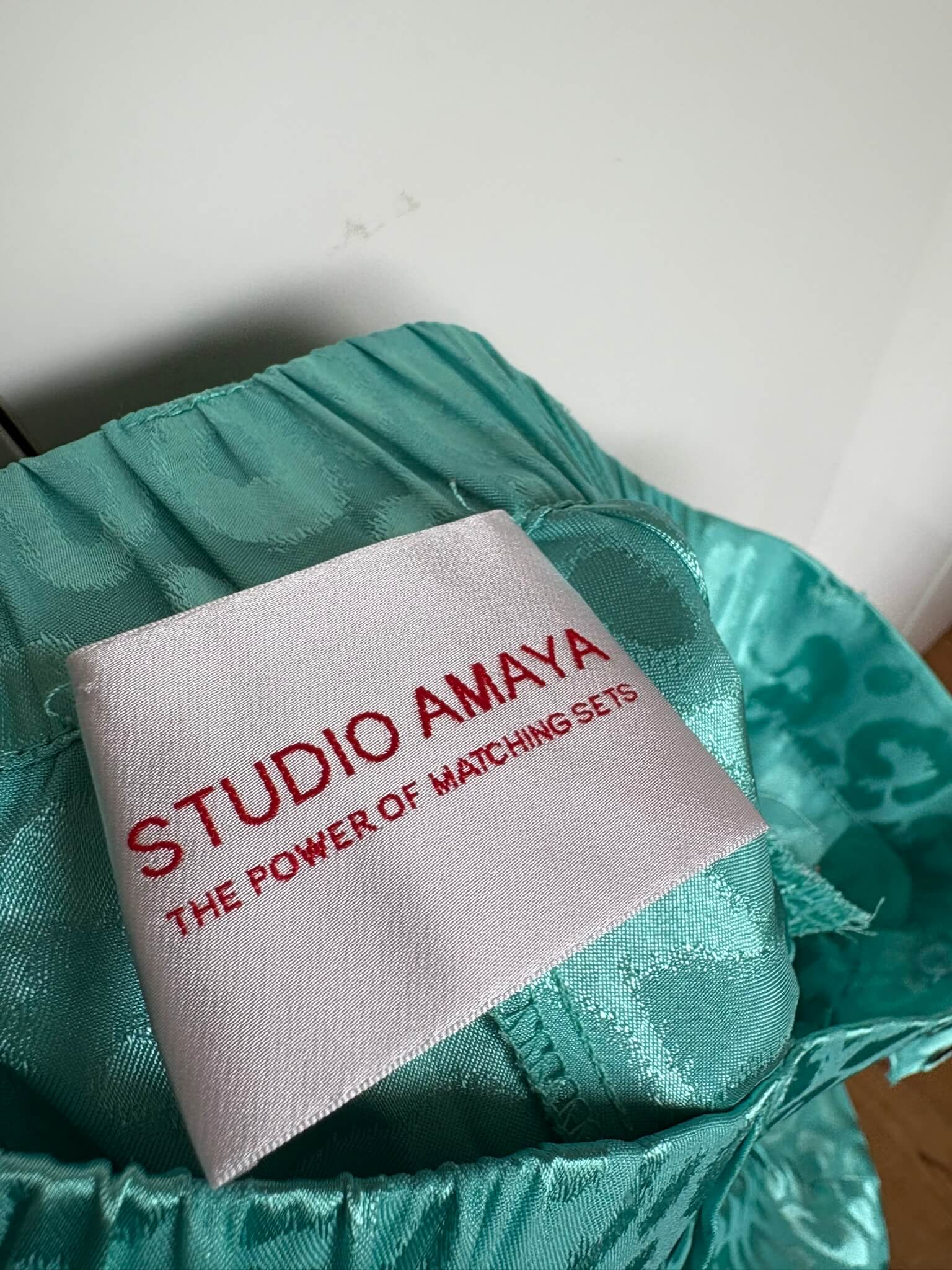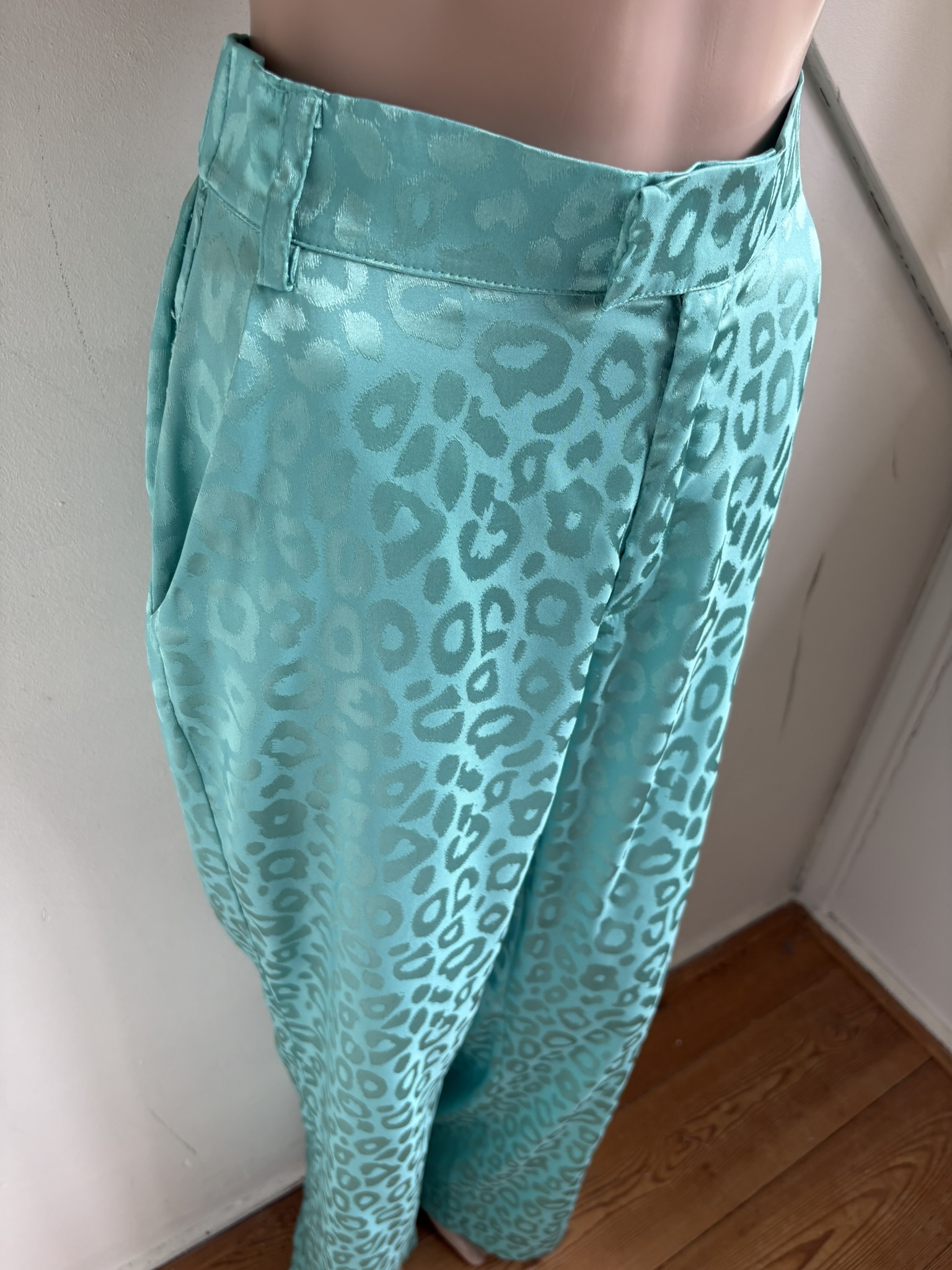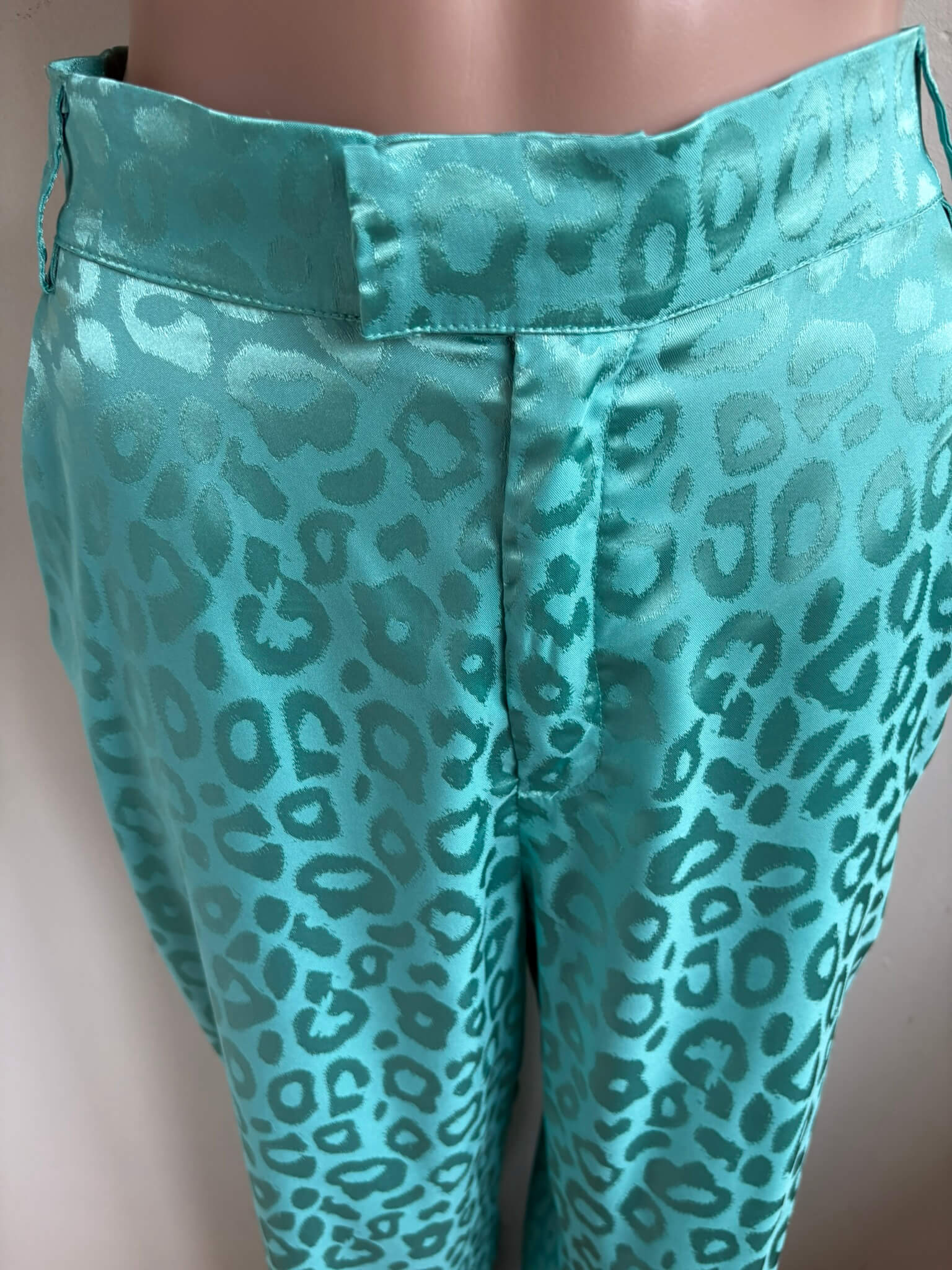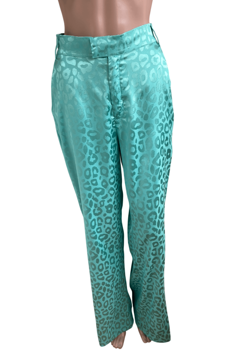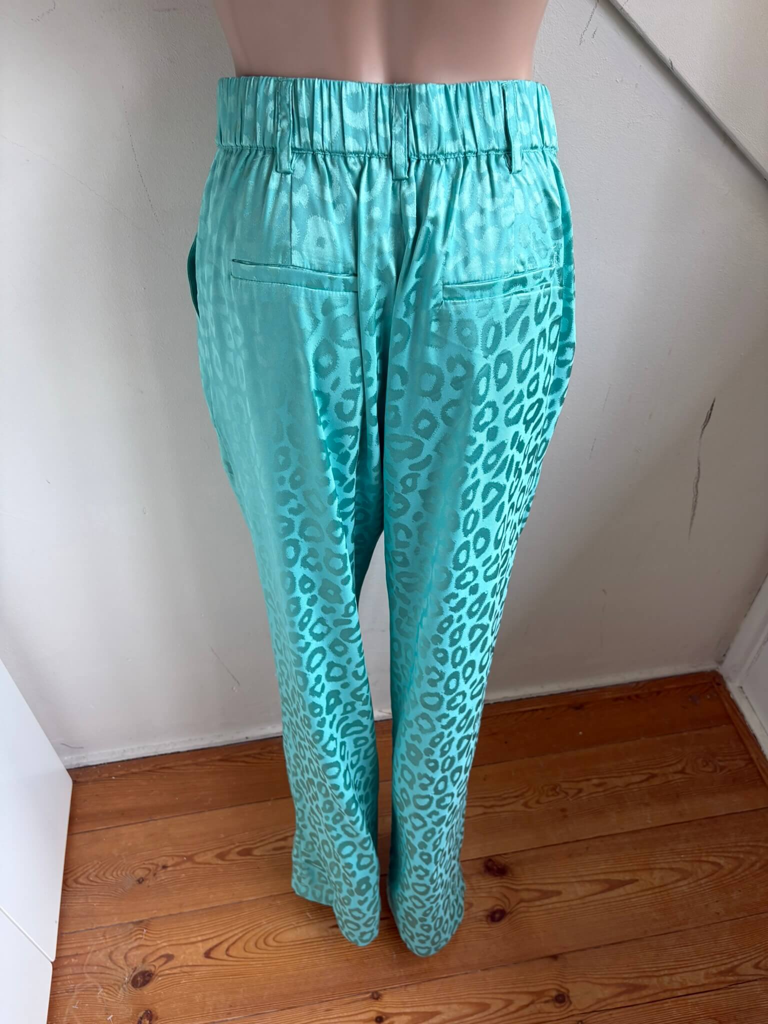 Groene broek met glanzende groene print in de maat M. “Anna Pants”. Gemaakt van polyester en elastaan. Taillewijdte 37 cm en lengte 112 cm.