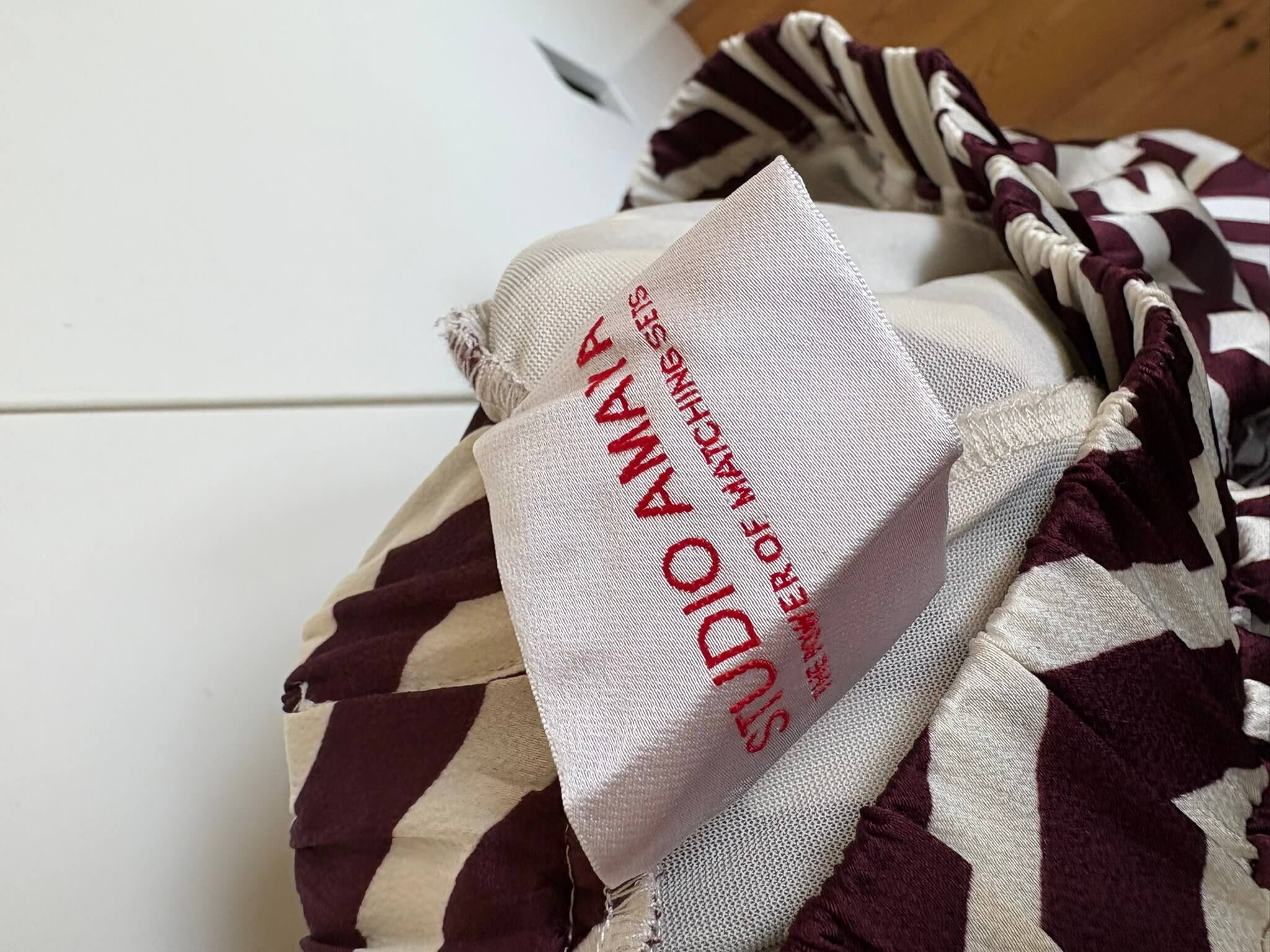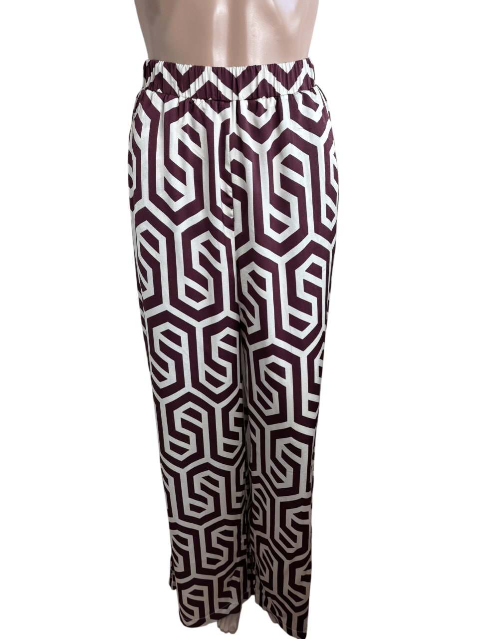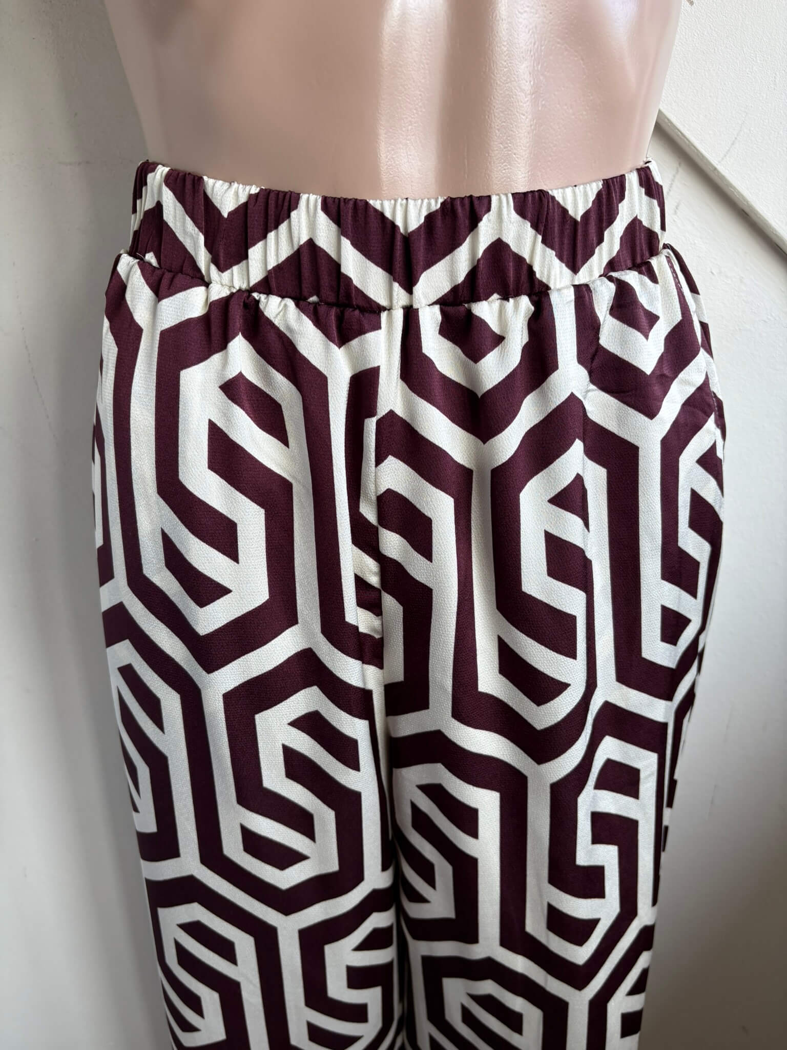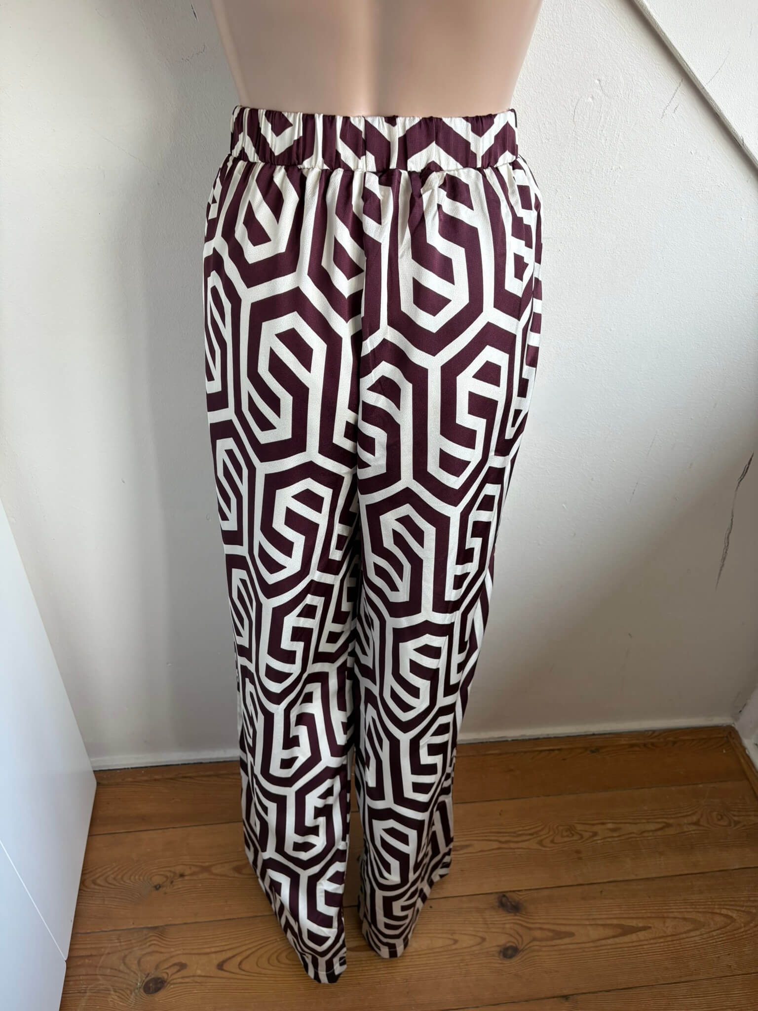 Offwhite broek met elastische taille en een donker paars aubergine print in de maat 38. Ik heb tussen mijn items een bijpassende blouse in dezelfde maat staan, zie foto’s. Taillewijdte 35 cm en lengte 116 cm. “Ryanna pants”. Gemaakt van polyester.