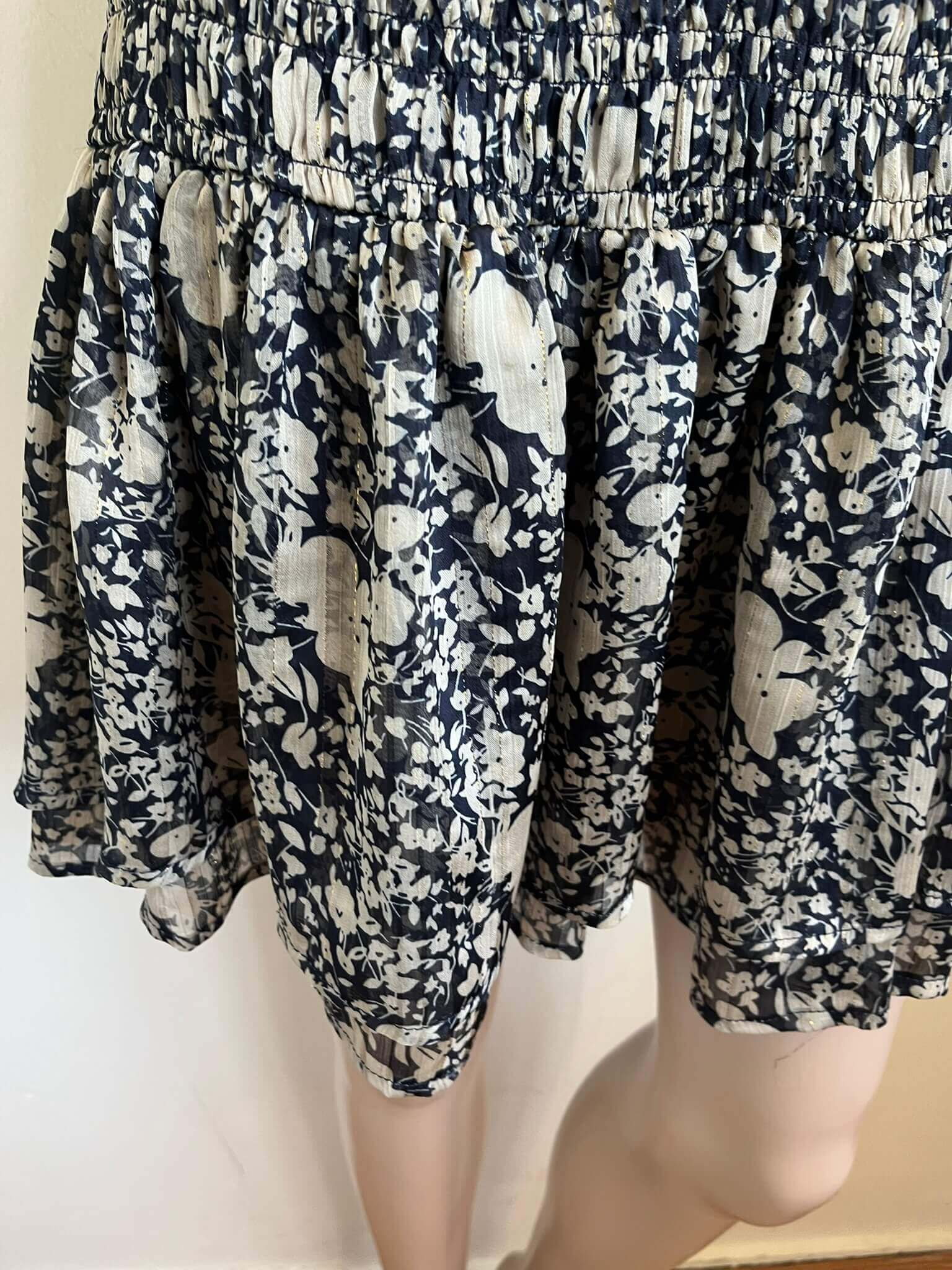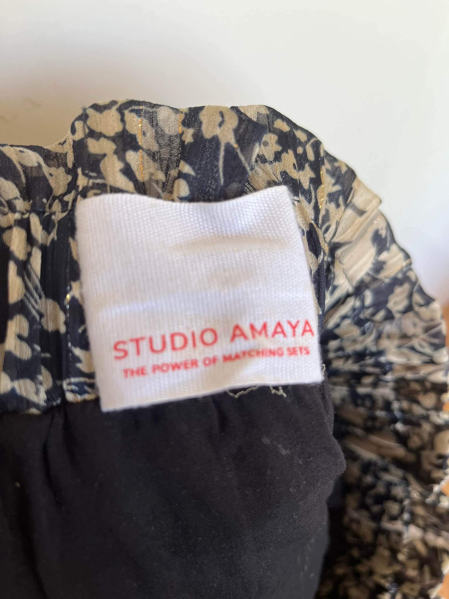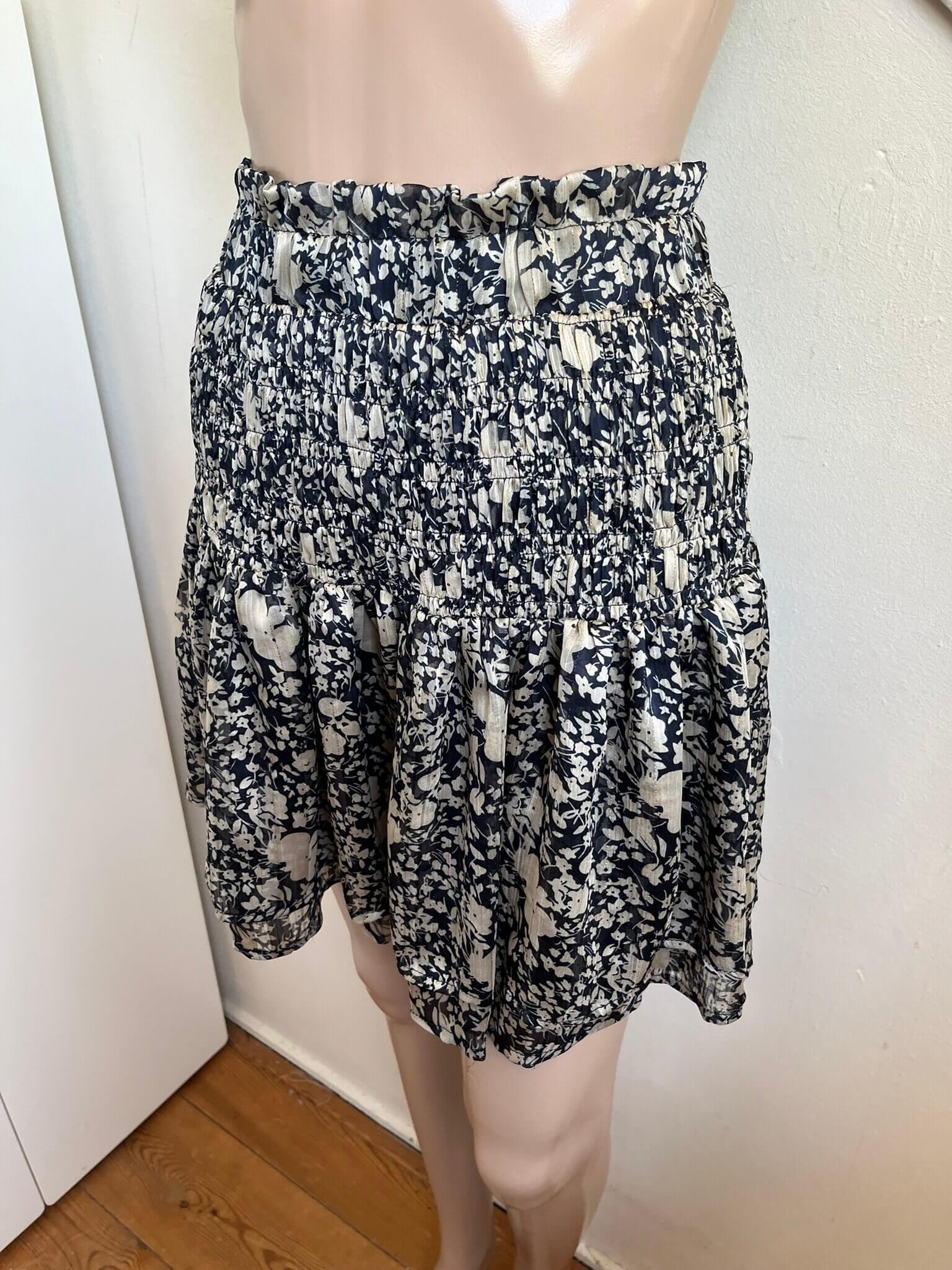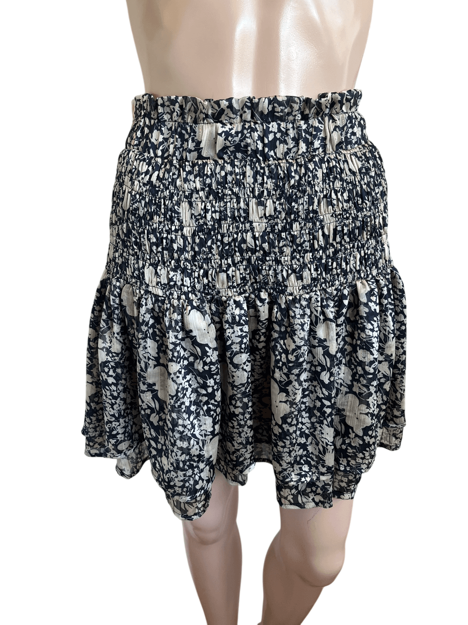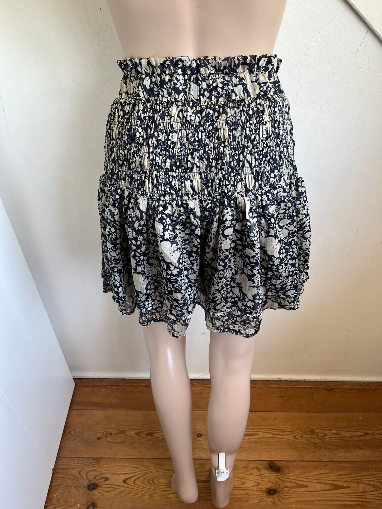 Stretch rok met een zwart beige print en gouddraad in de maat 36/38. Bovenste helft is geheel stretch en de taillewijdte is 35 cm en lengte 48 cm.