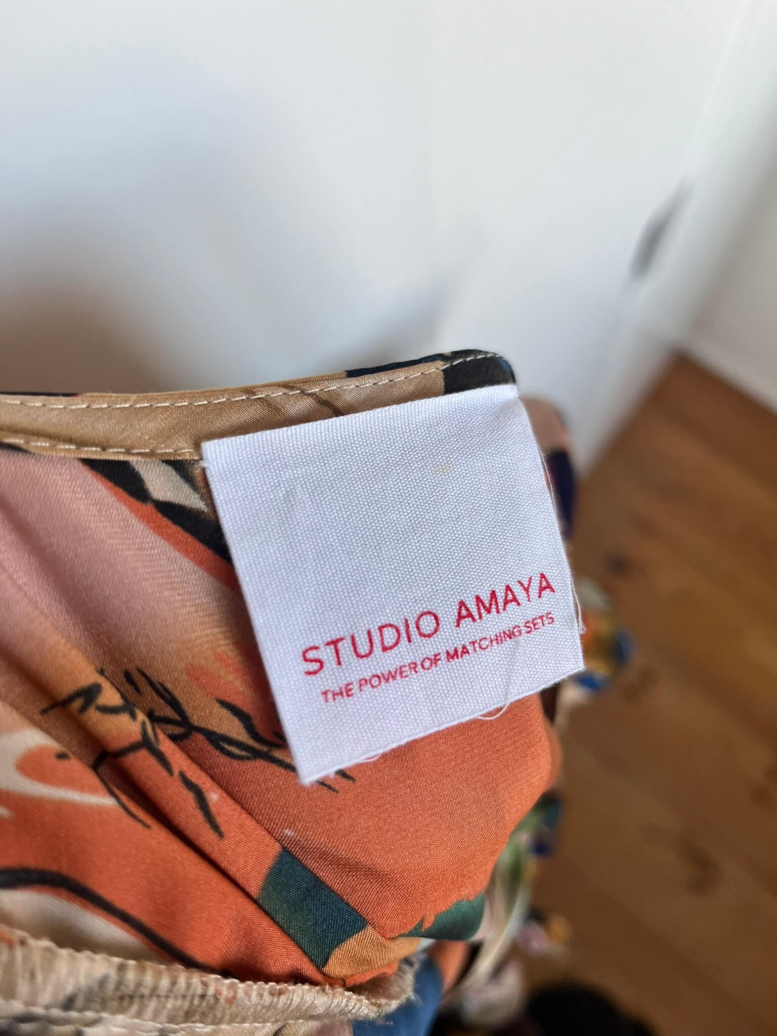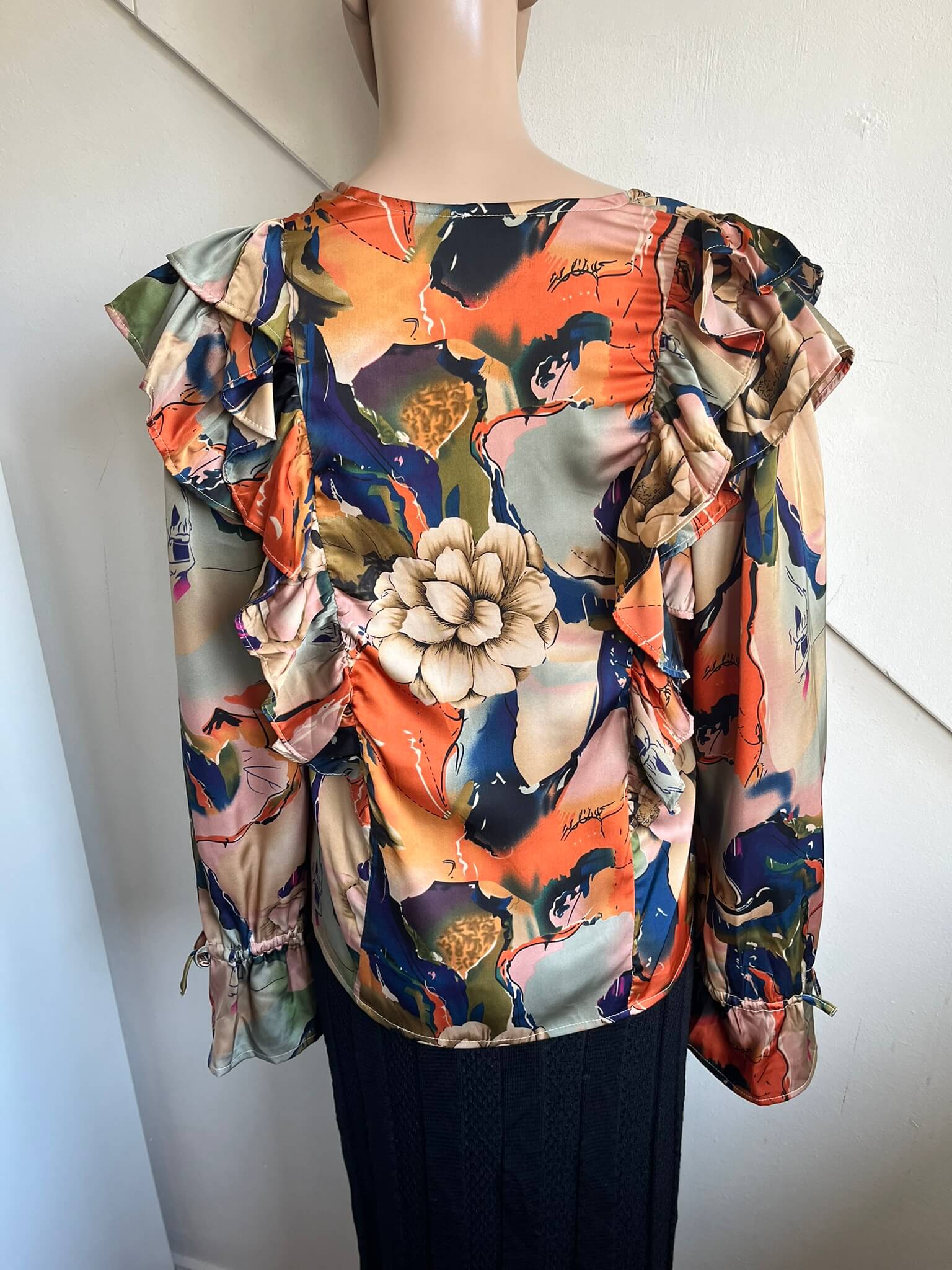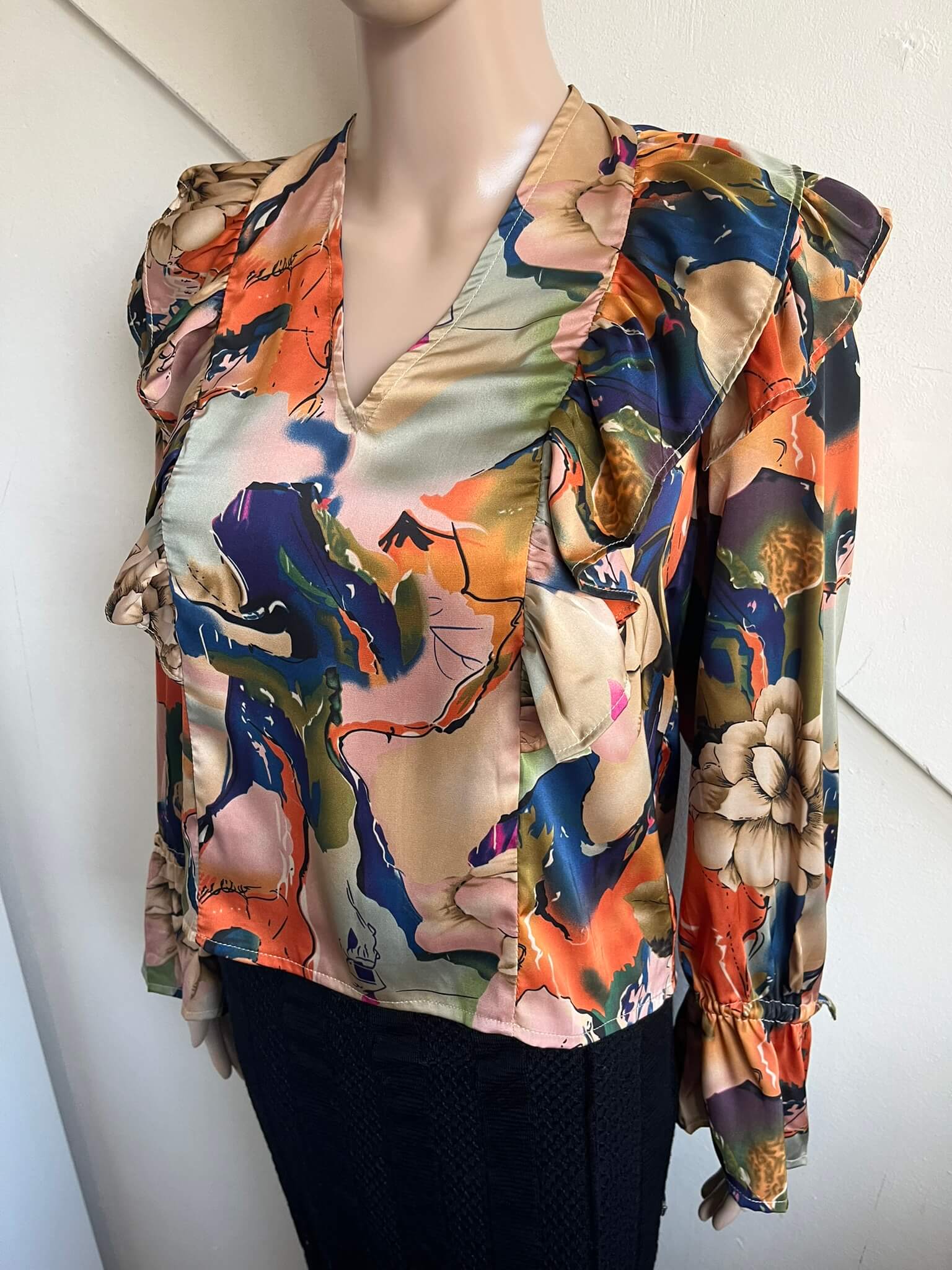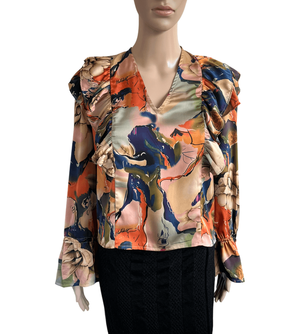 Mooie heel licht glanzende blouse of top met roezels in herfstkleurem, bruin blauw oranje. “Morgan Blouse”, gemaakt van polyester. Oksellengte 47 cm en lengte 60 cm.