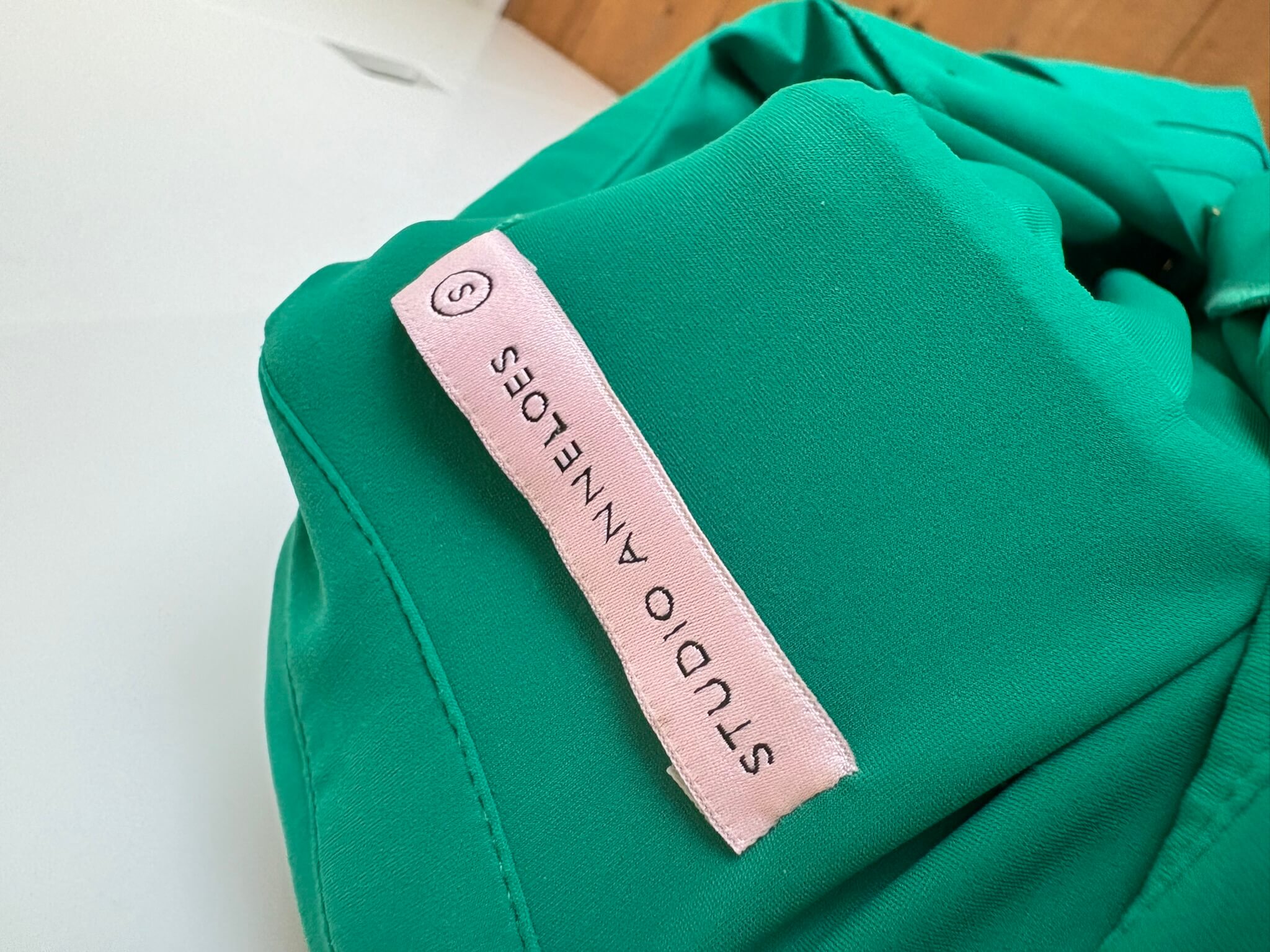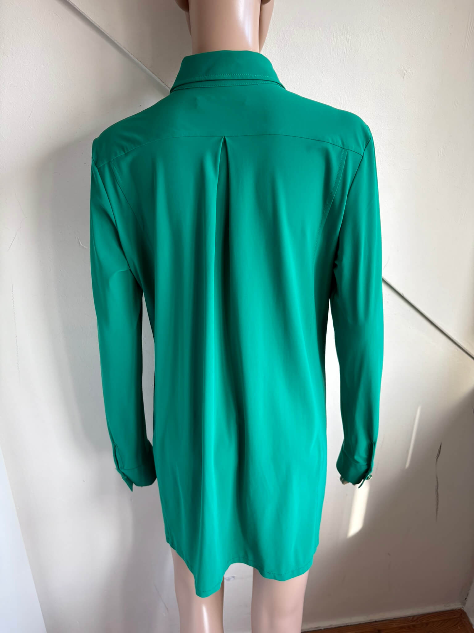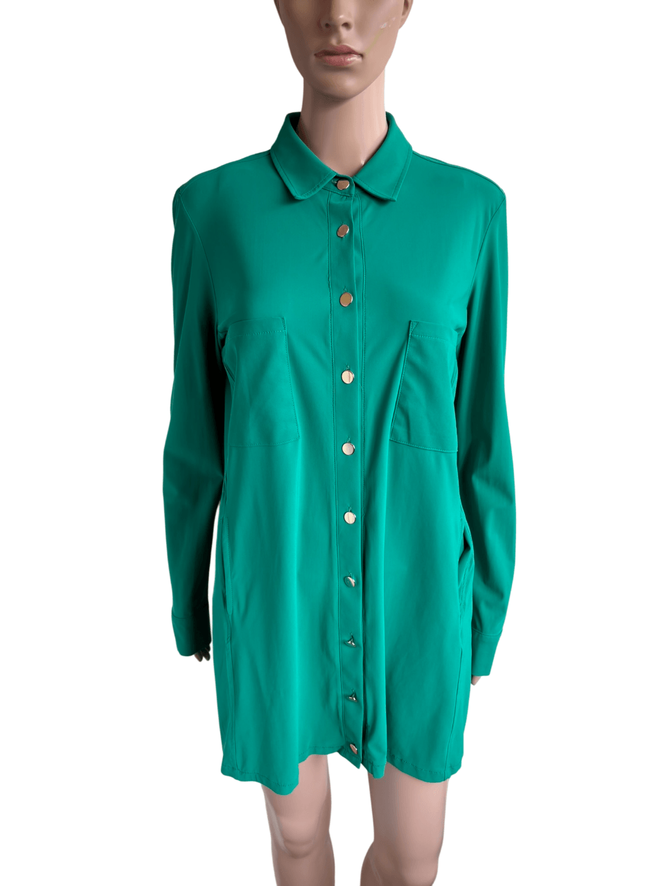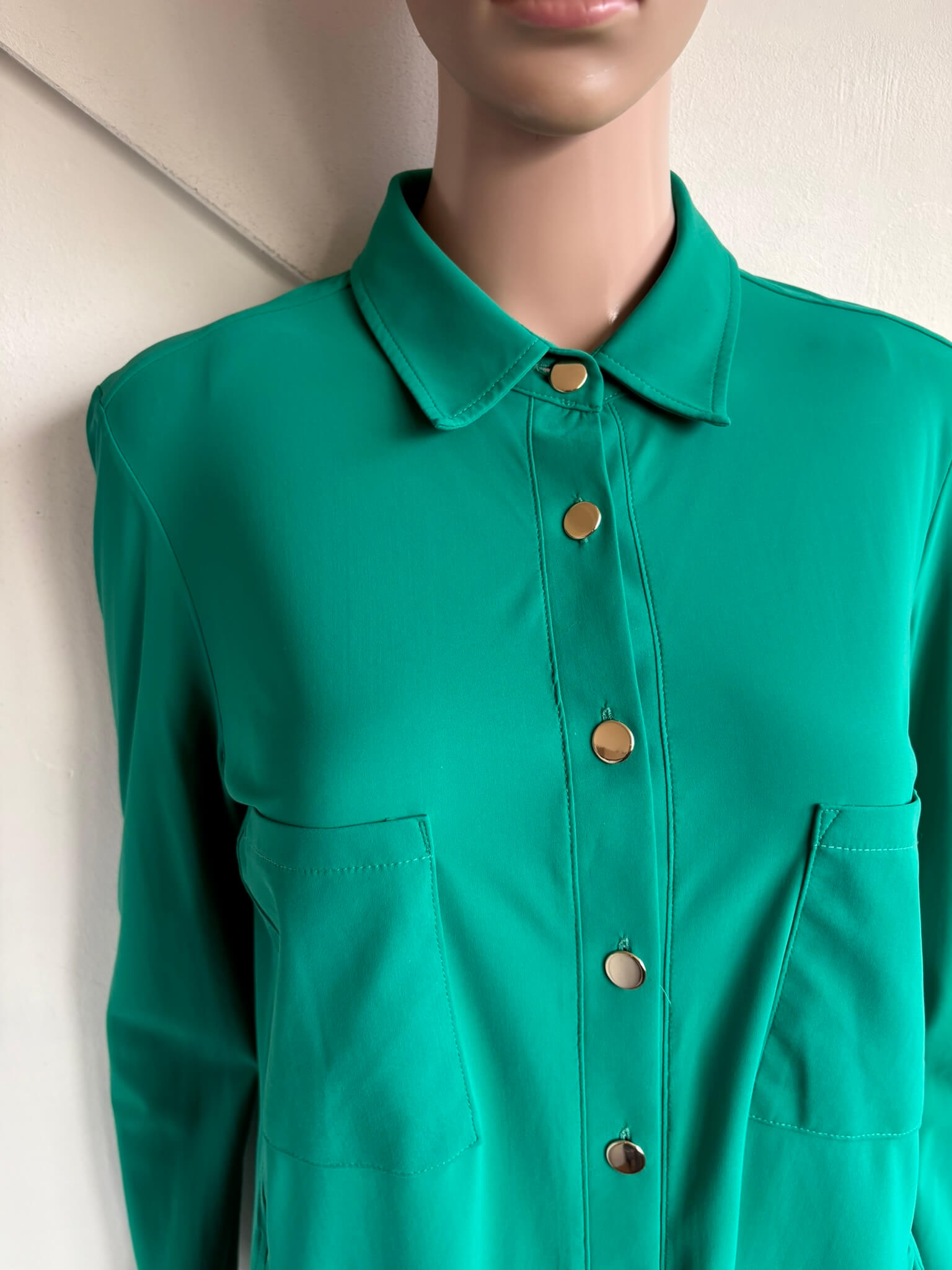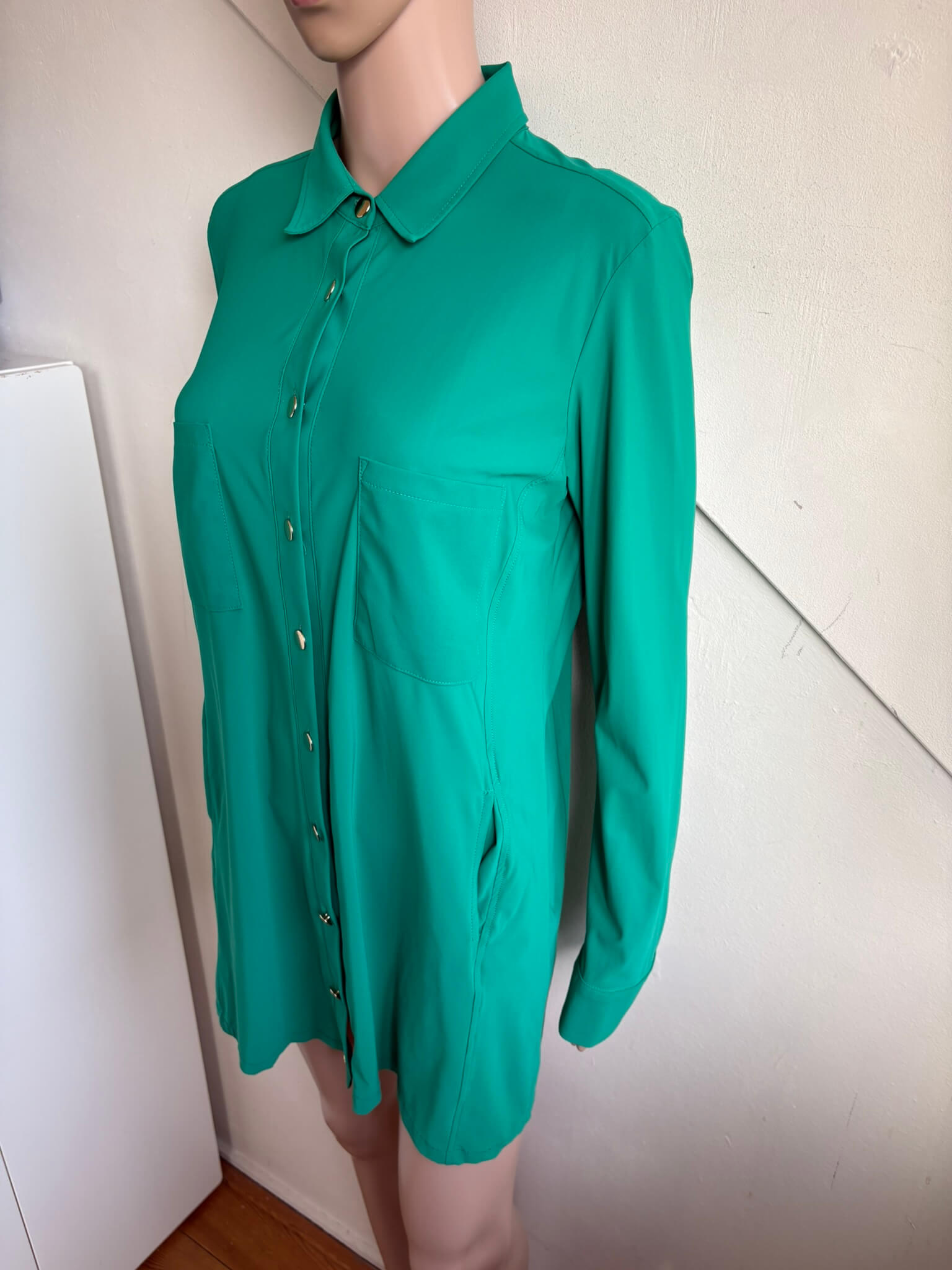 Groene travelstof lange blouse of tuniek met steekzakken, en goudkleurige knopen in de maat S. Gemaakt van polyamide en elastaan. Oksellengte 53 cm en lengte 78 cm.