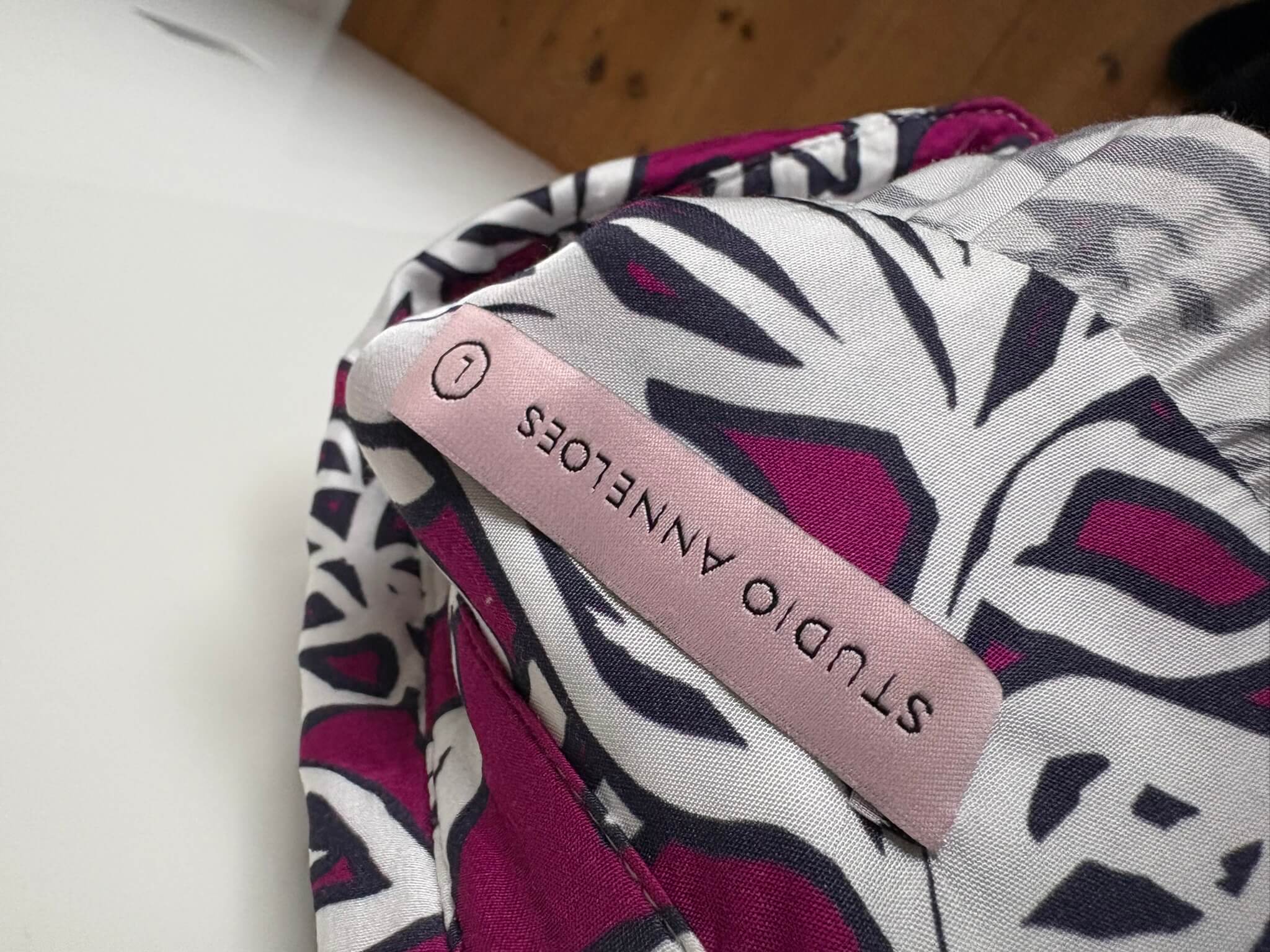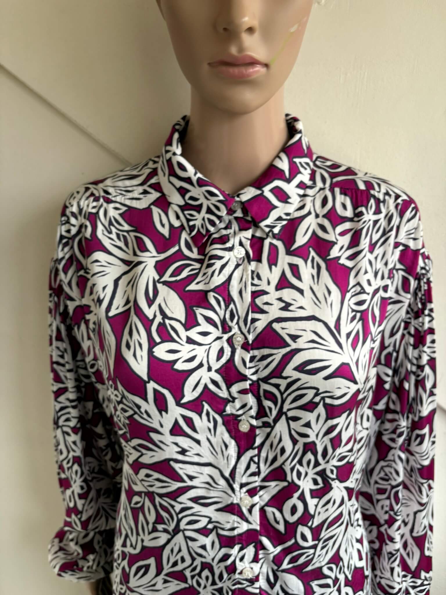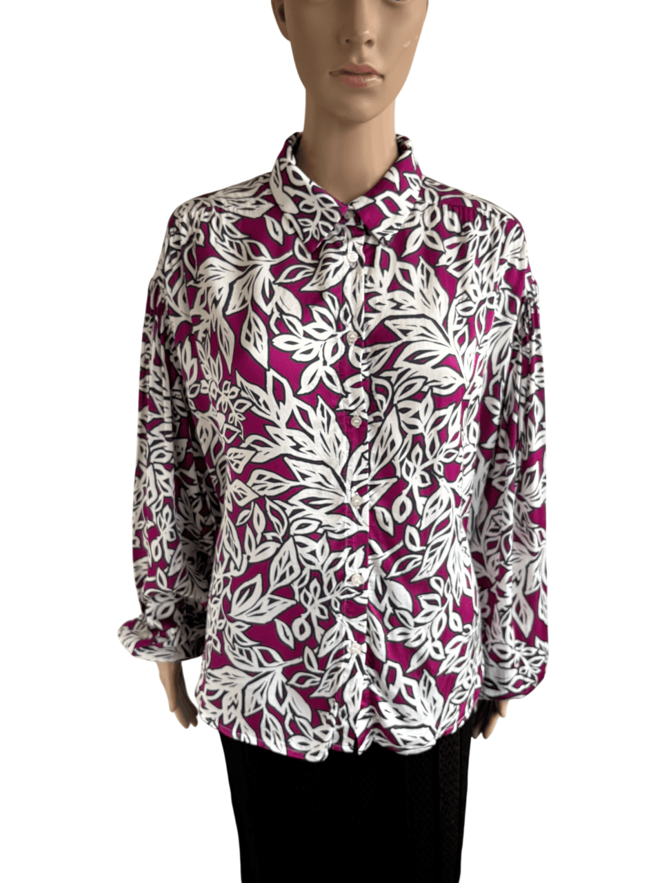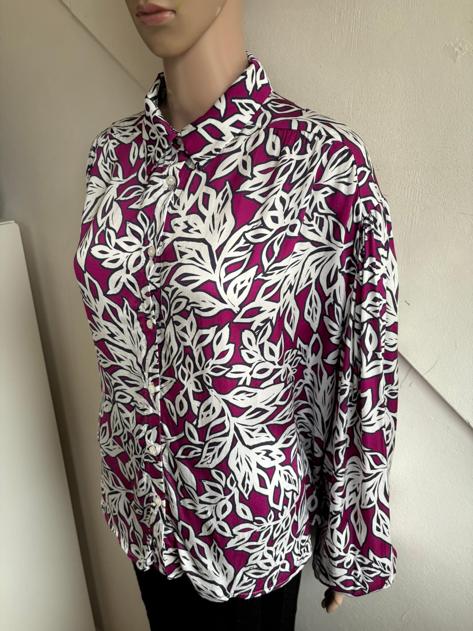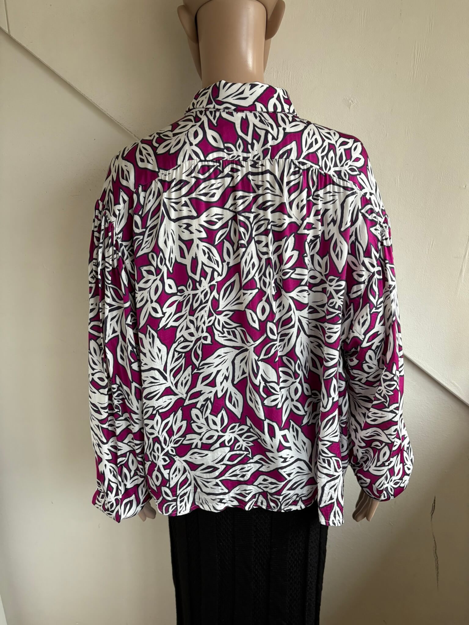 Witte luctige blouse met een donkerroze en zwarte bladeren print en wijde mouwen in de maat L. Gemaakt van viscose. Esmee Satin Blouse, itemnummer 07825. Oksellengte 65 cm en lengte 64 cm.