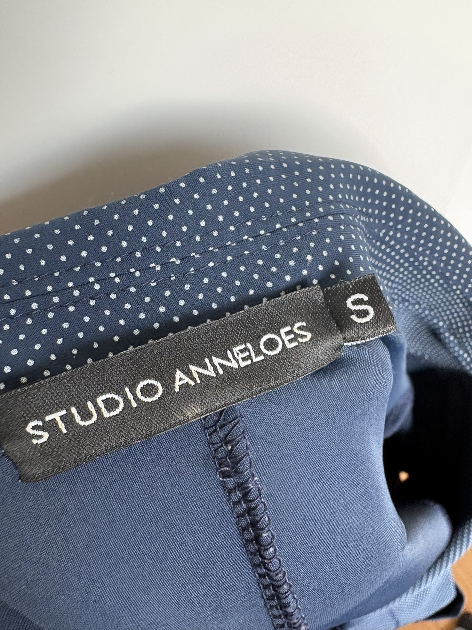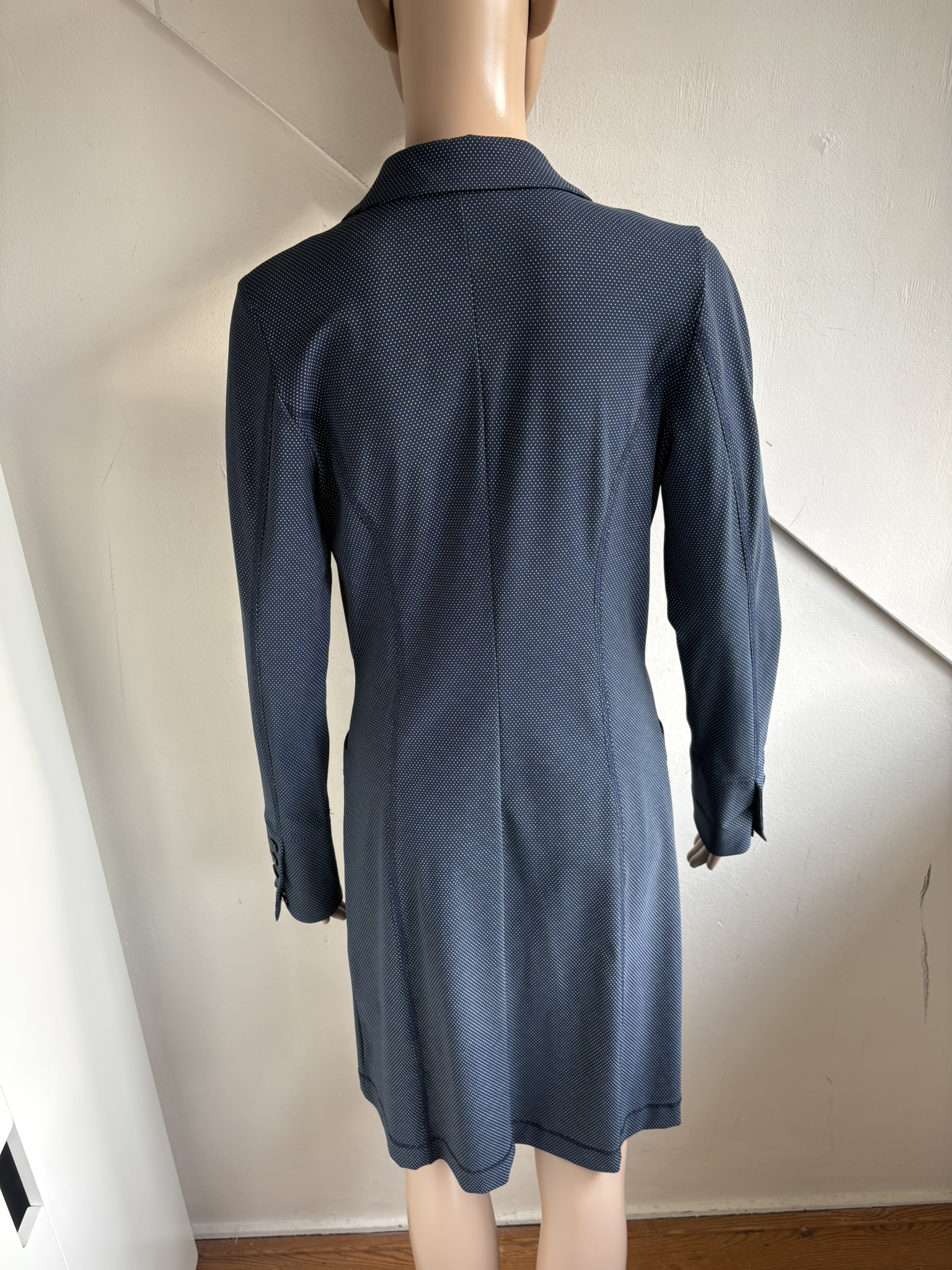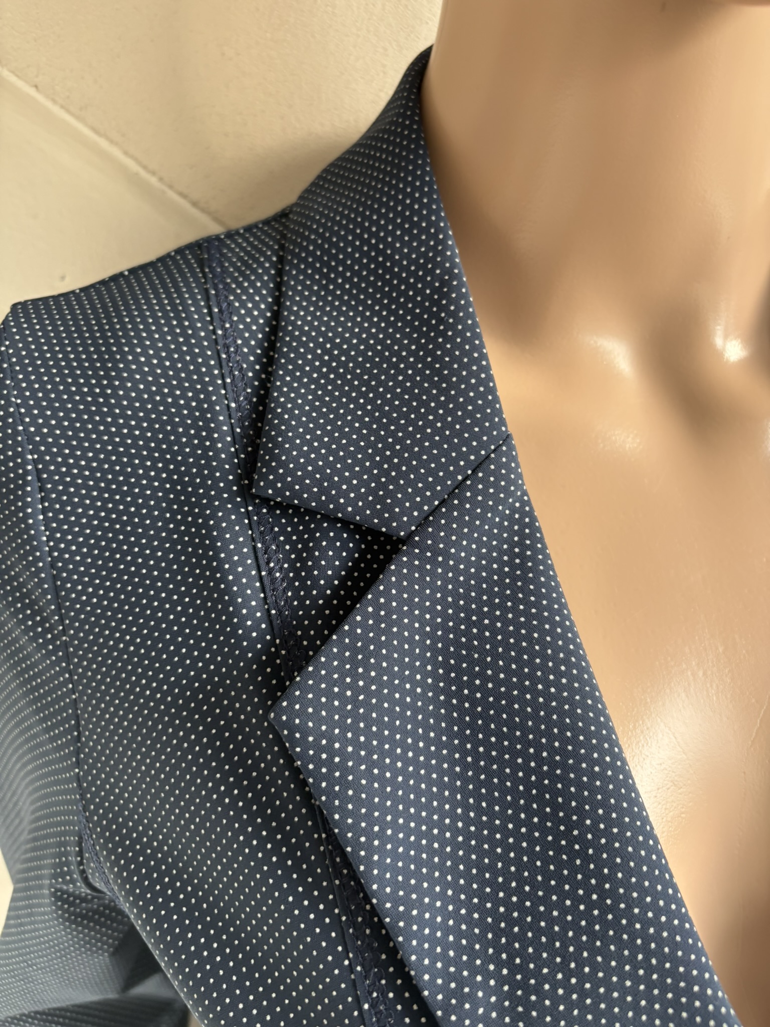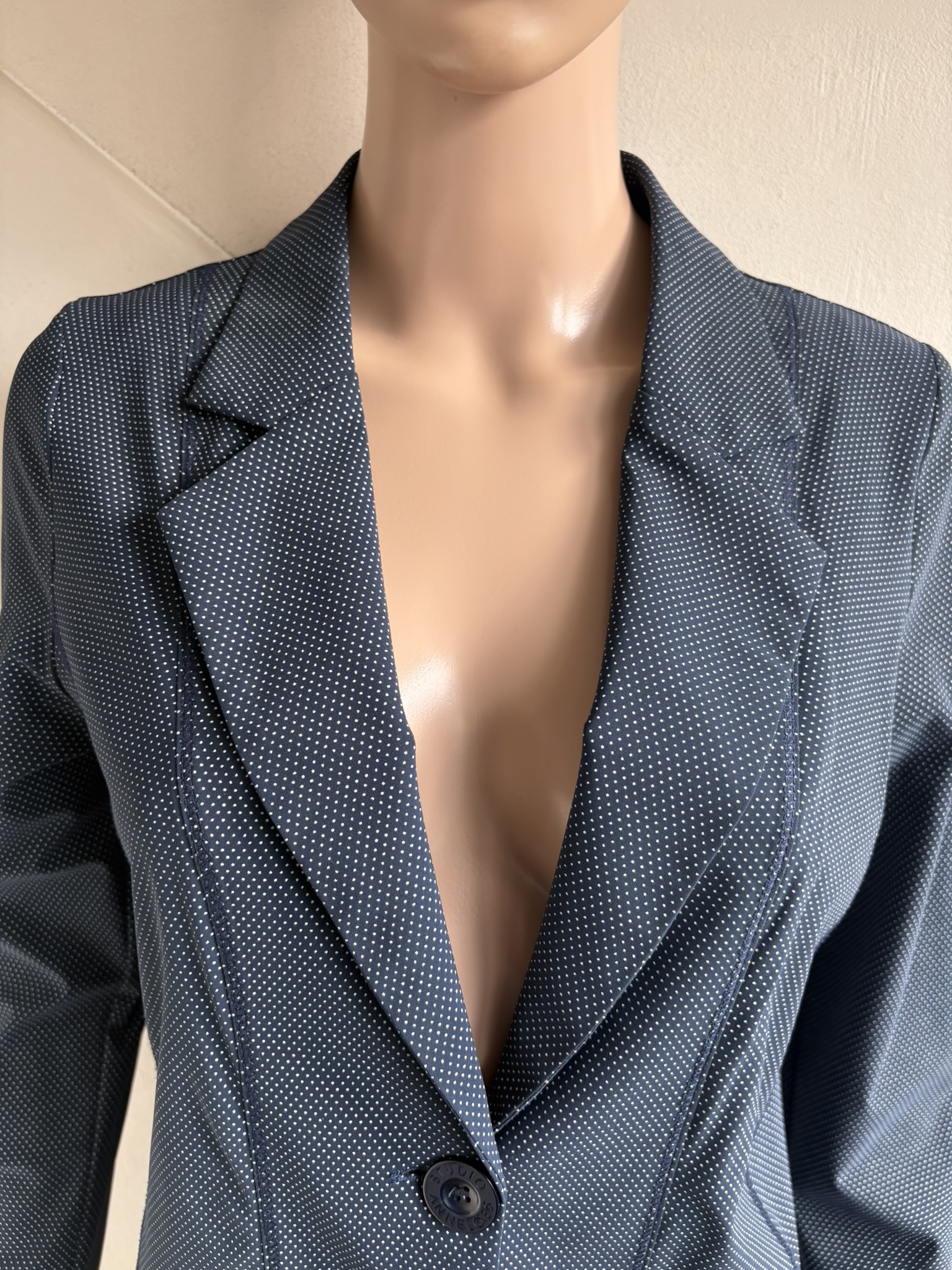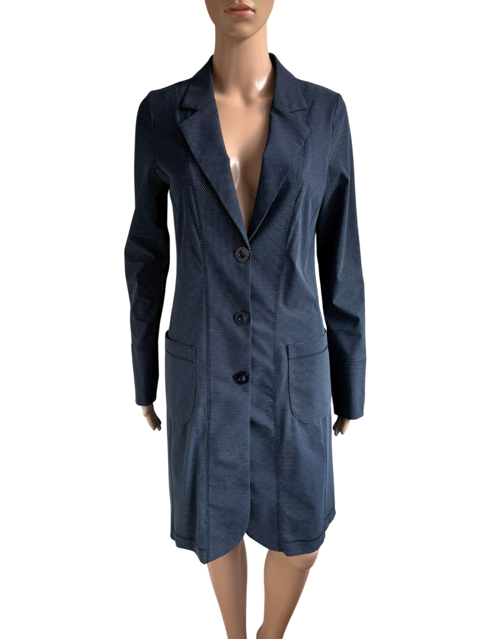 Donkerblauwe lange travelstof blazer met witte stippen in de maat S. Oksellengte 45 cm en lengte 92 cm.