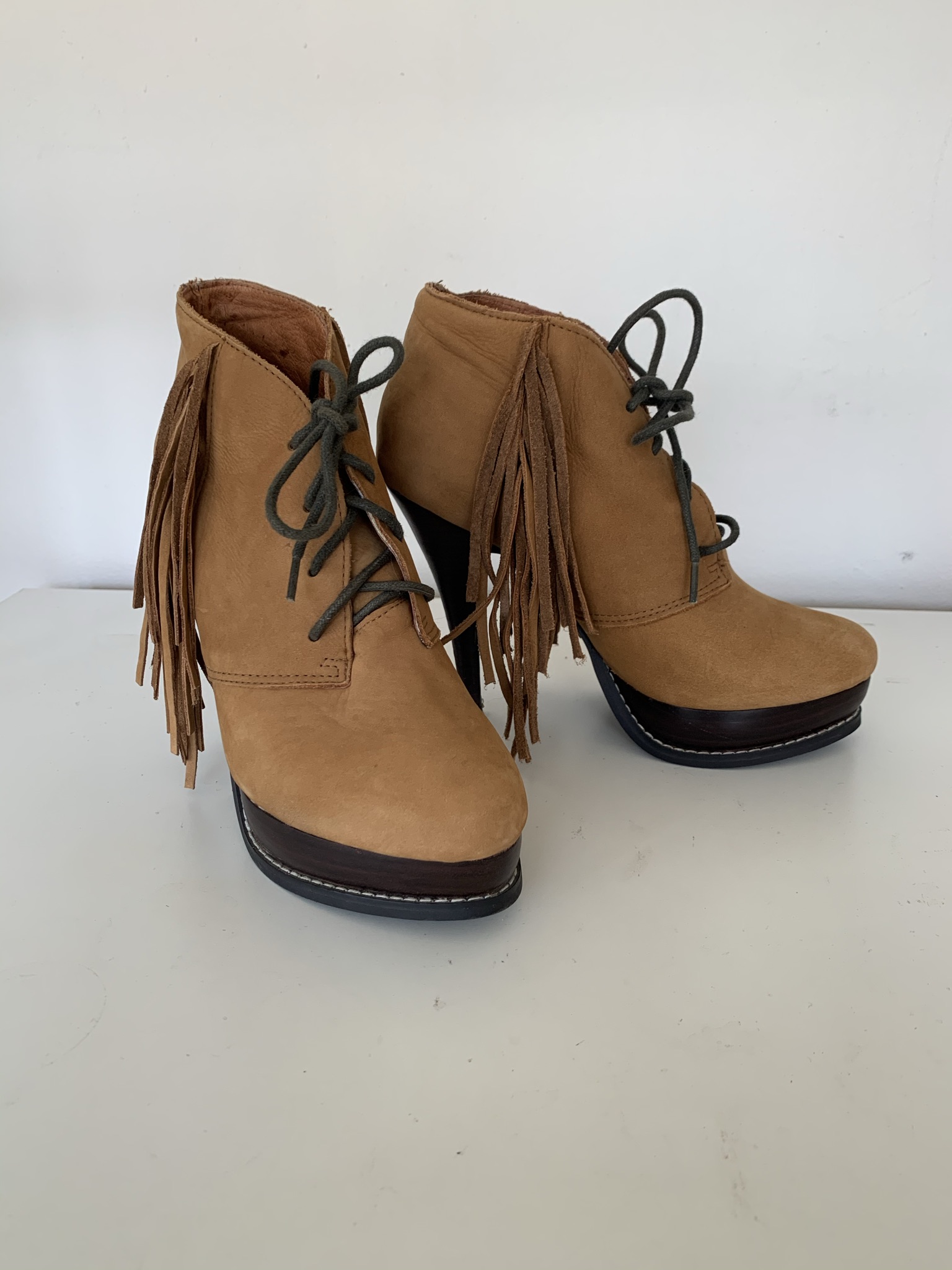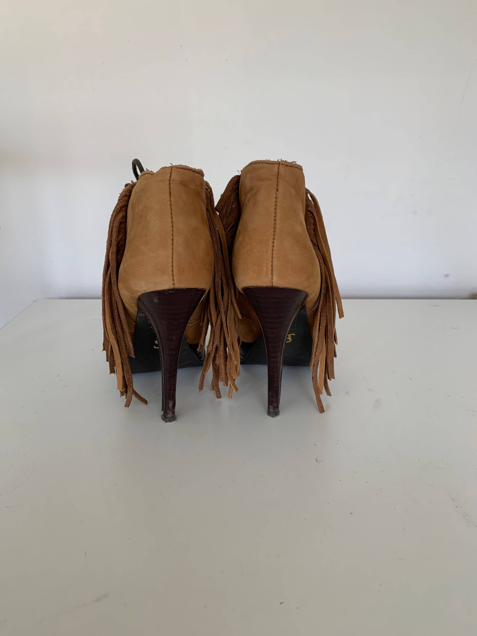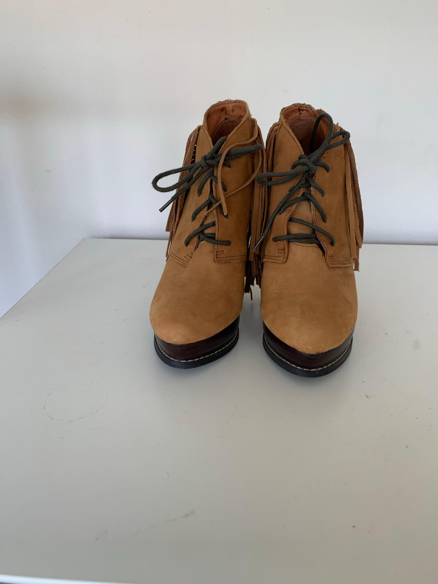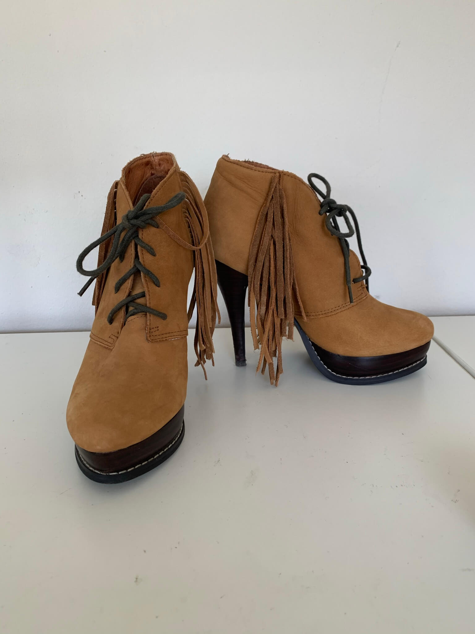 Geweldige suede bruine enkellaarzen met franjes in de maat 37. Hakhoogte hoogste punt 12 cm
