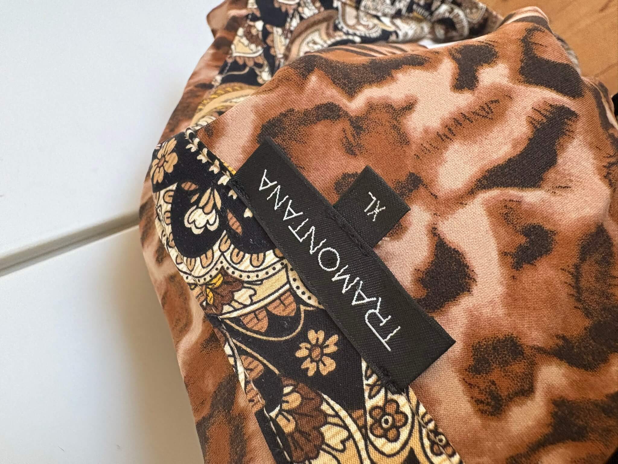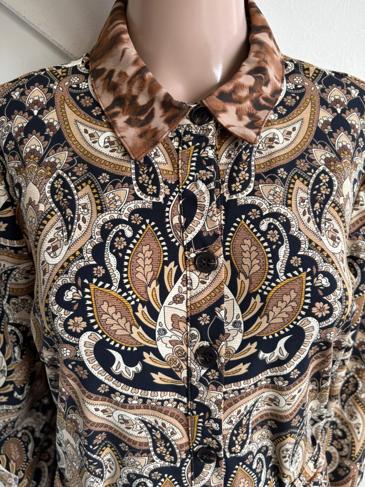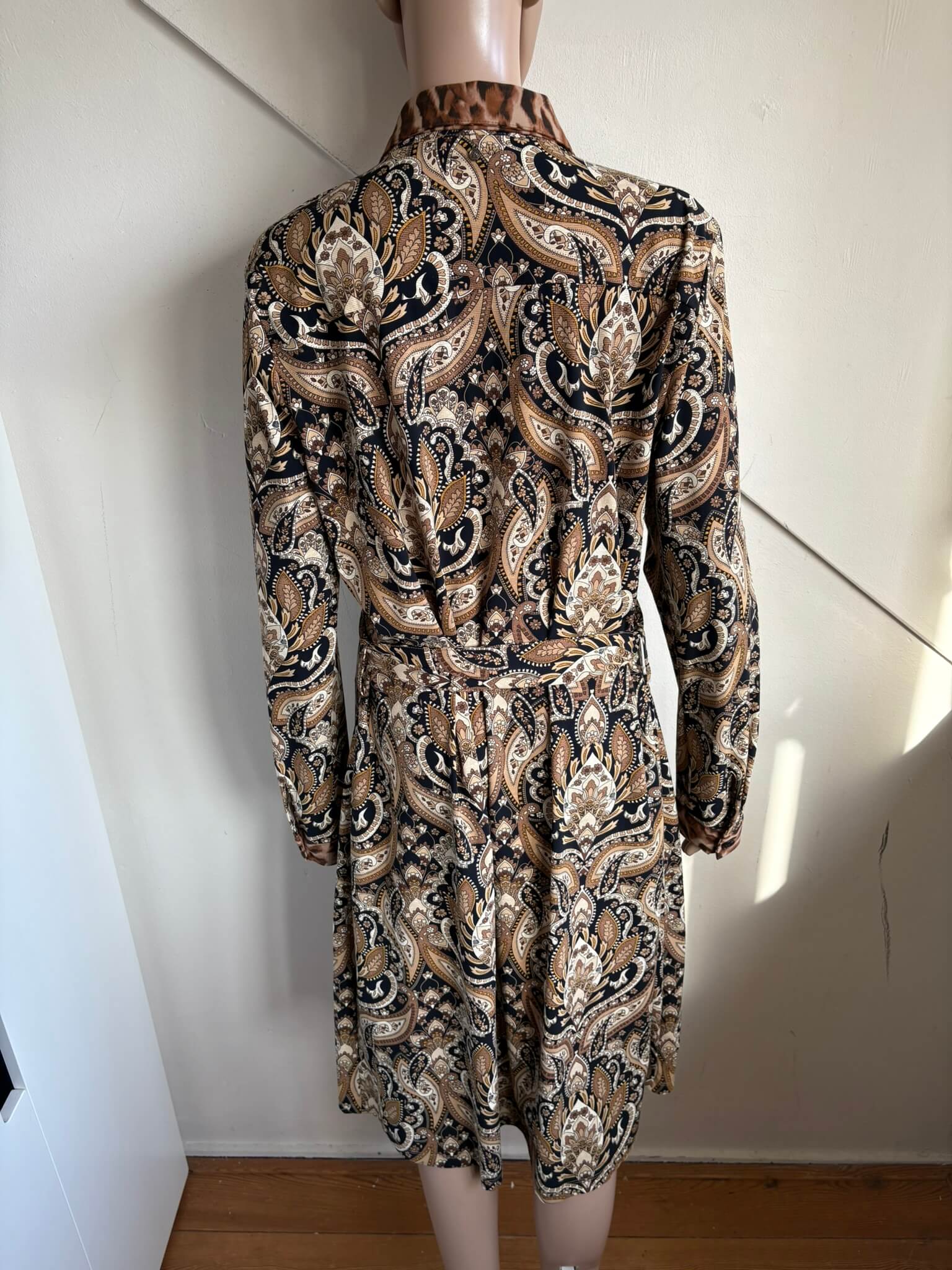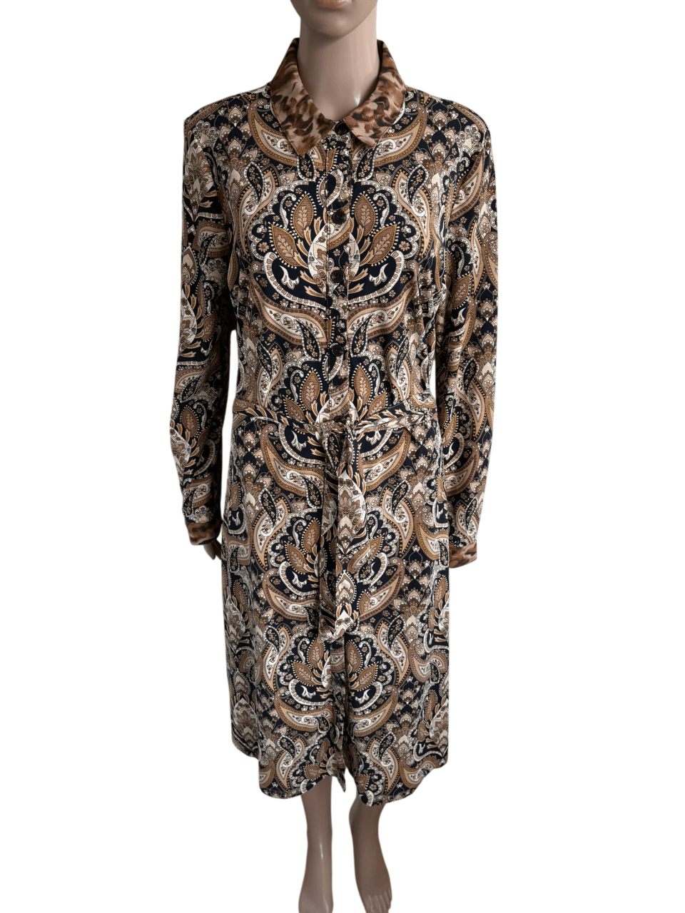 Mooie lange travelstof doorknoopjurk met riem en een bruine paisley print in de maat XL, 42 / 44. Gemaakt van polyamide en elastaan. Oksellengte 57 cm en lengte 107 cm.
